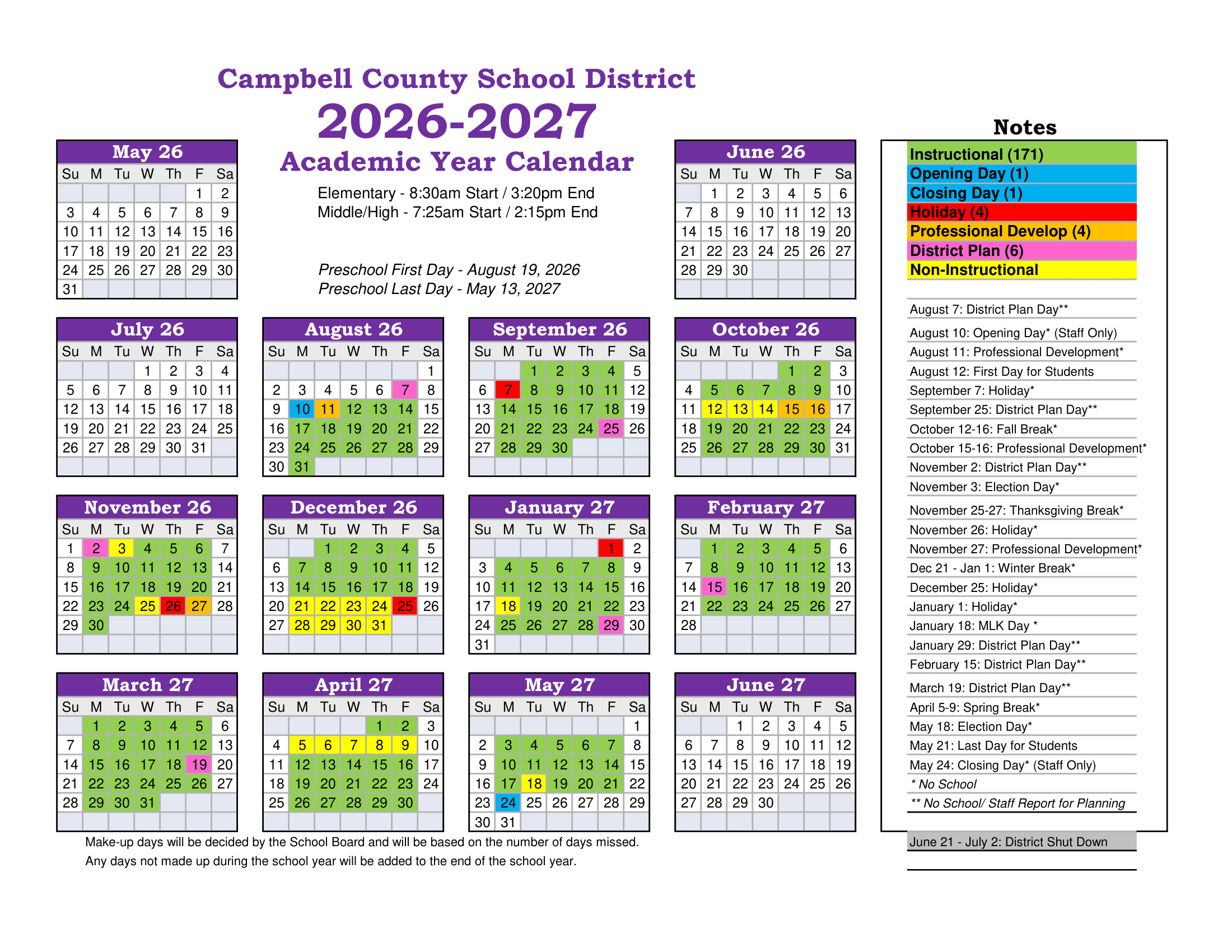 Dates are sourced from the official Campbell County School District 26-27 Calendar Updates[PDF] website. Dates may change at the discretion of the district. Always verify with the official school website for the latest updates.