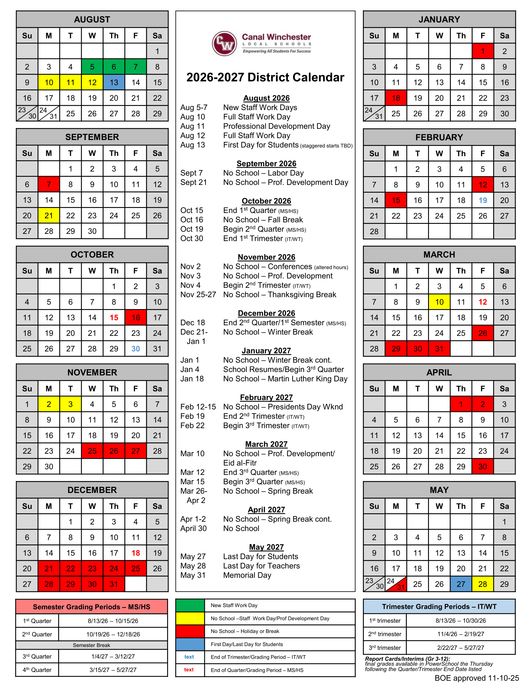 Dates are sourced from the official Canal Winchester Local Schools Calendar 26-27 Updates website. Dates may change at the discretion of the district. Always verify with the official school website for the latest updates.