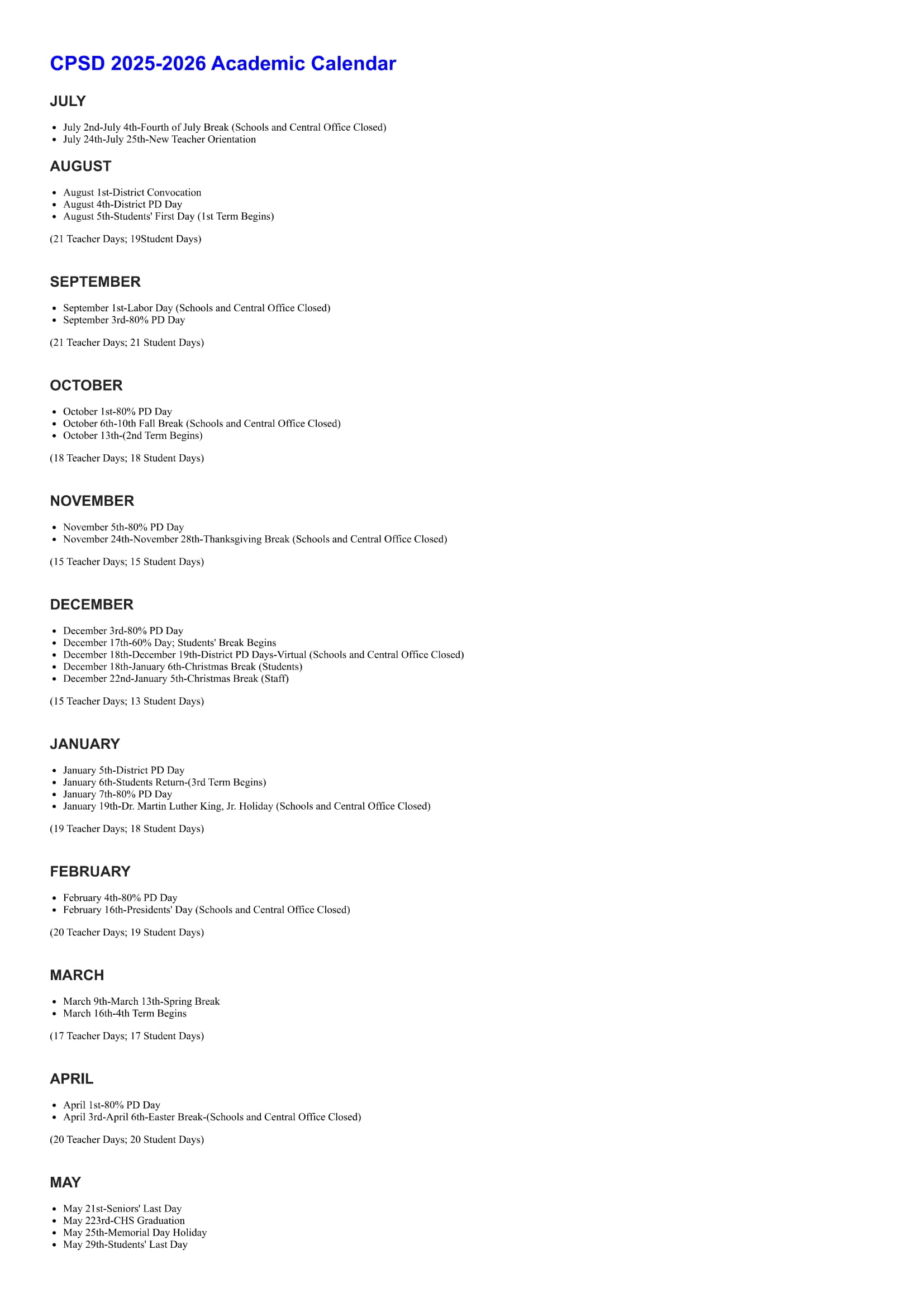 | Jan 19, 2026 | Dr. Martin Luther King, Jr. Holiday (Schools and Central Office Closed) |