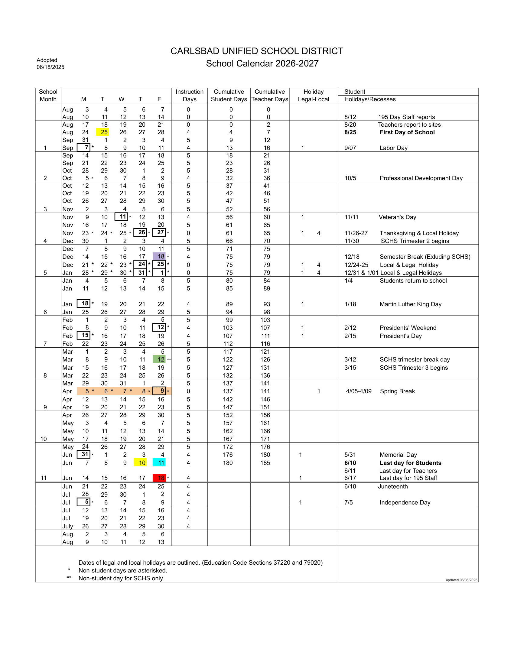 Dates are sourced from the official Carlsbad Unified School District 26-27 Calendar [PDF] website. Dates may change at the discretion of the district. Always verify with the official school website for the latest updates.