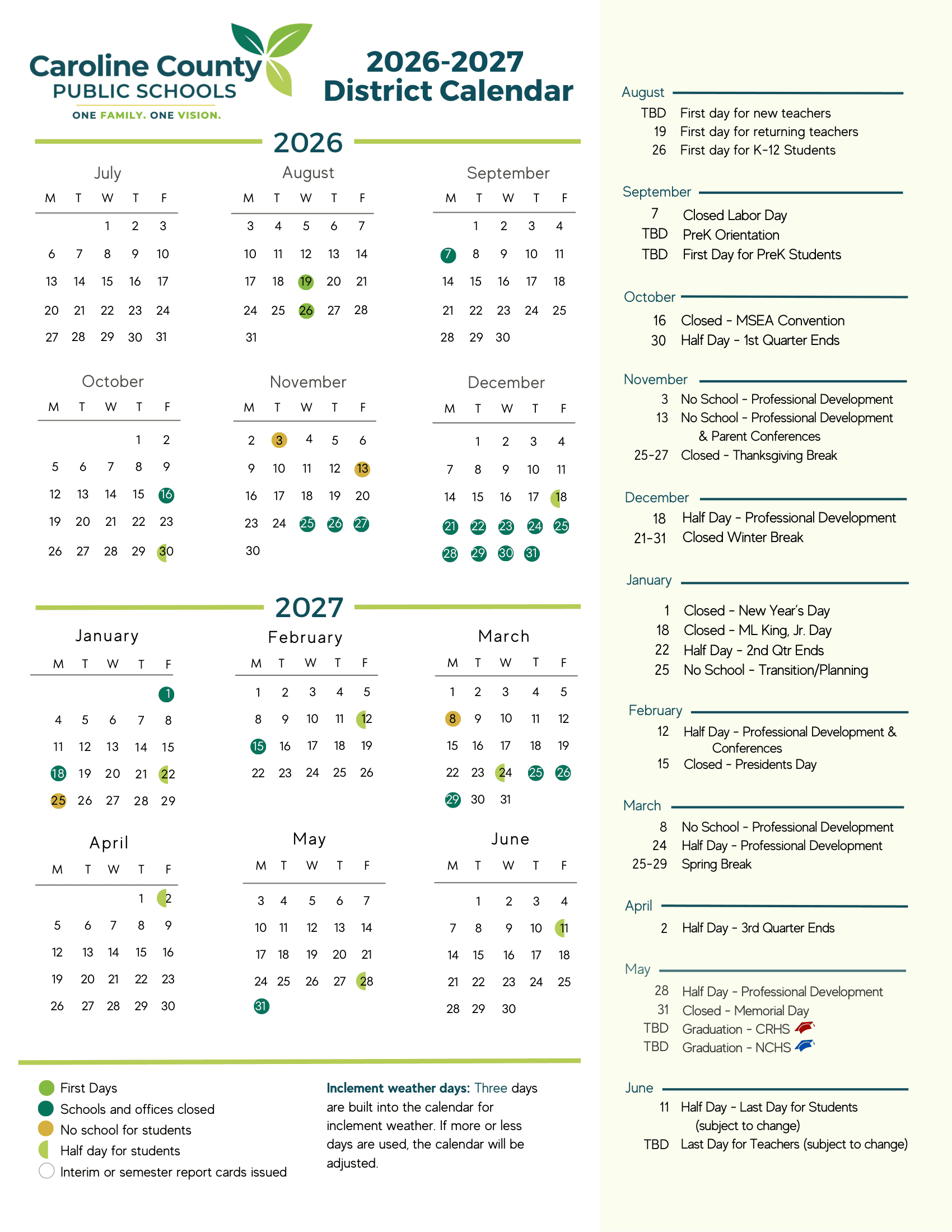 Dates are sourced from the official Caroline County Public Schools 26-27 Calendar Updates website. Dates may change at the discretion of the district. Always verify with the official school website for the latest updates.