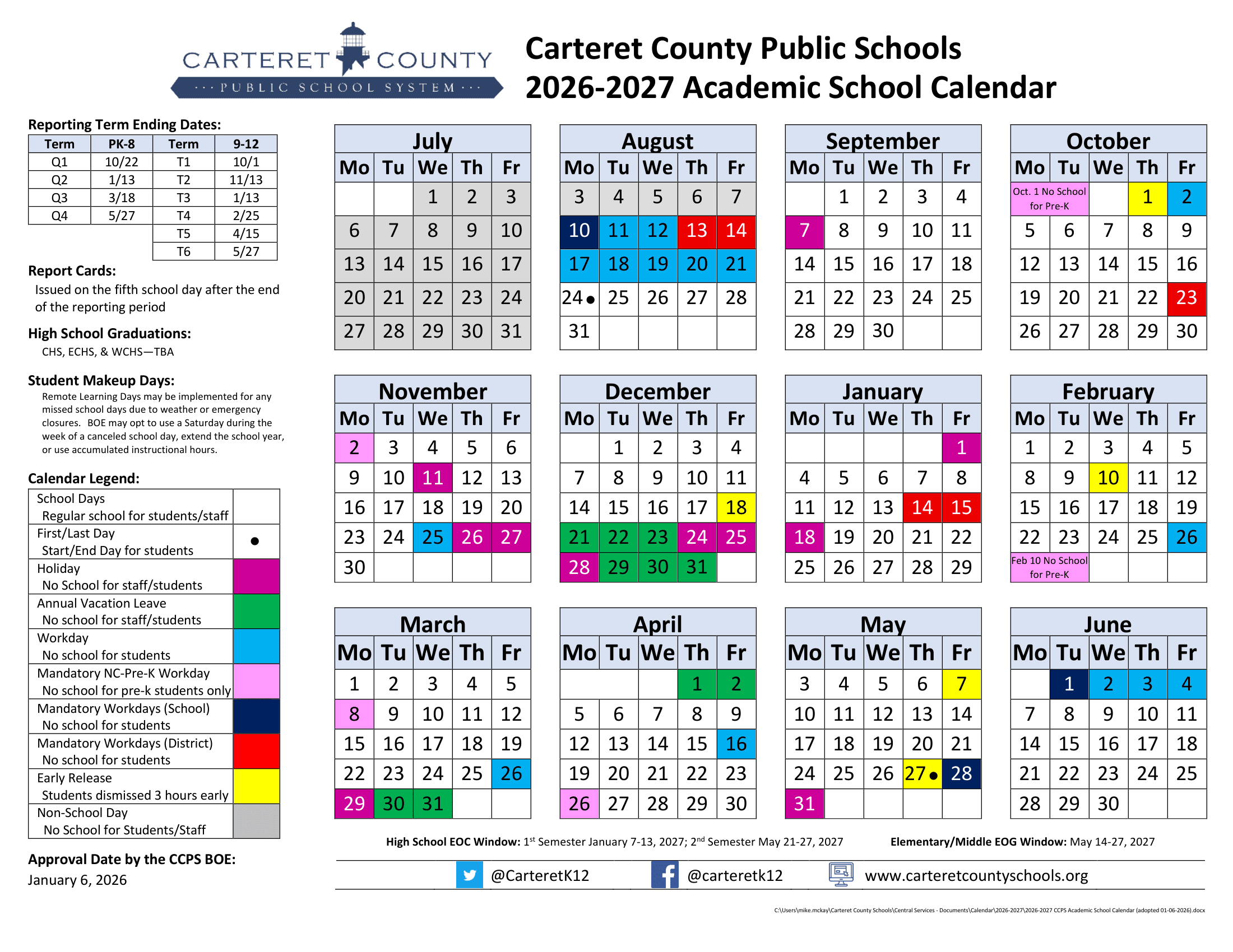 Dates are sourced from the official Carteret county NC School Calendar 26-27 [pdf] website. Dates may change at the discretion of the district. Always verify with the official school website for the latest updates.