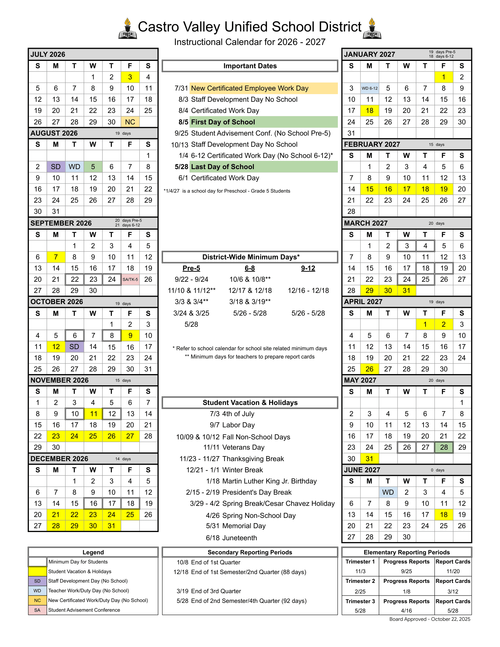 Dates are sourced from the official Castro Valley Unified School District usd 26-27 Calender website. Dates may change at the discretion of the district. Always verify with the official school website for the latest updates.