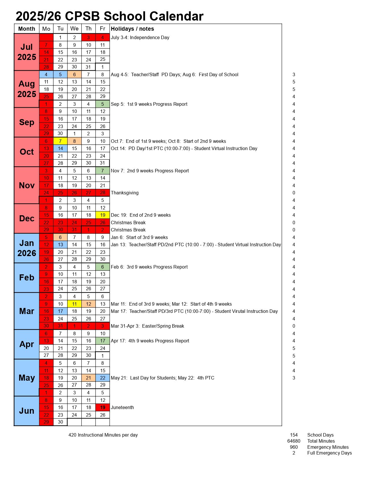 CPSB School Calendar (2025-2026)
