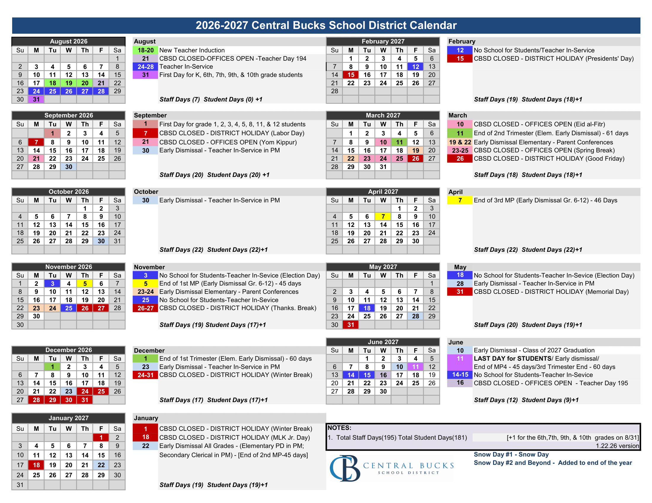 Central Bucks School District Calendar (2026-2027)