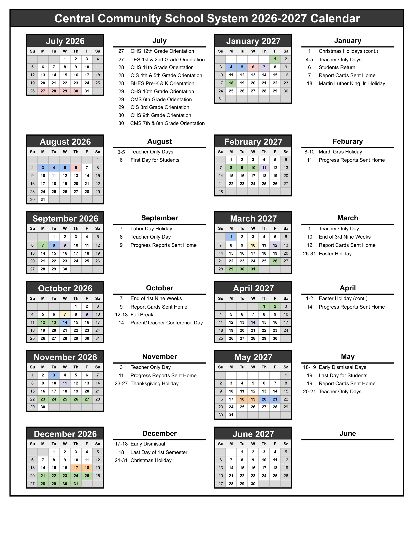 Central Community School System Calendar (2026-2027)