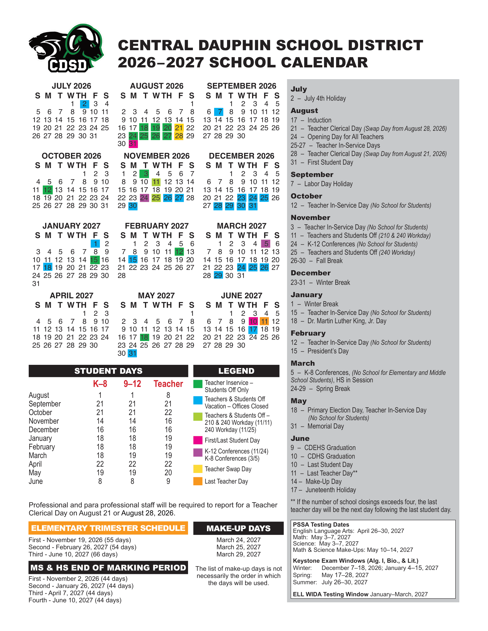Dates are sourced from the official Central Dauphin School District 26-27 Calendar Updated [PDF] website. Dates may change at the discretion of the district. Always verify with the official school website for the latest updates.