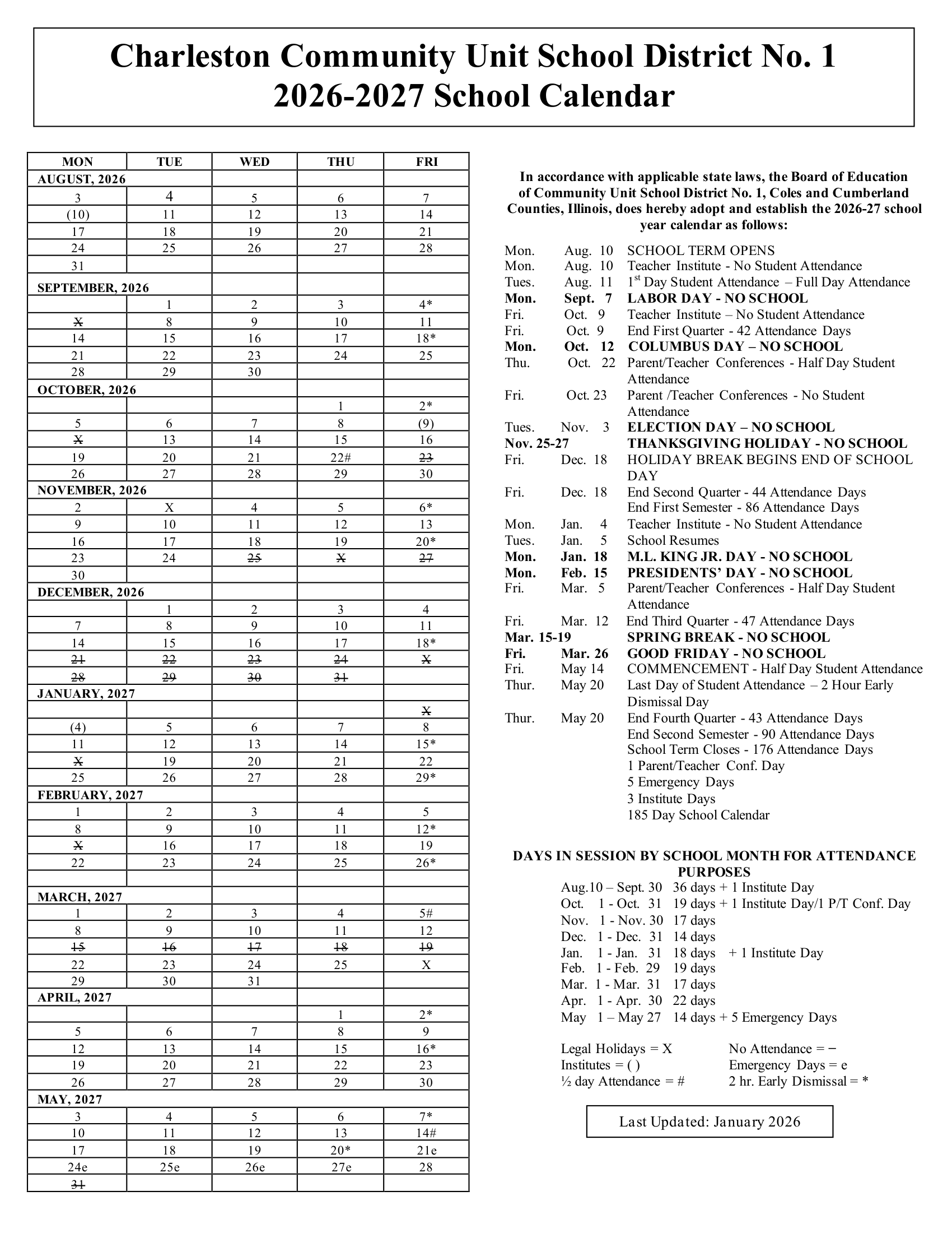 Charleston Community Unit School CUSD1 Calendar 26/27 Updates