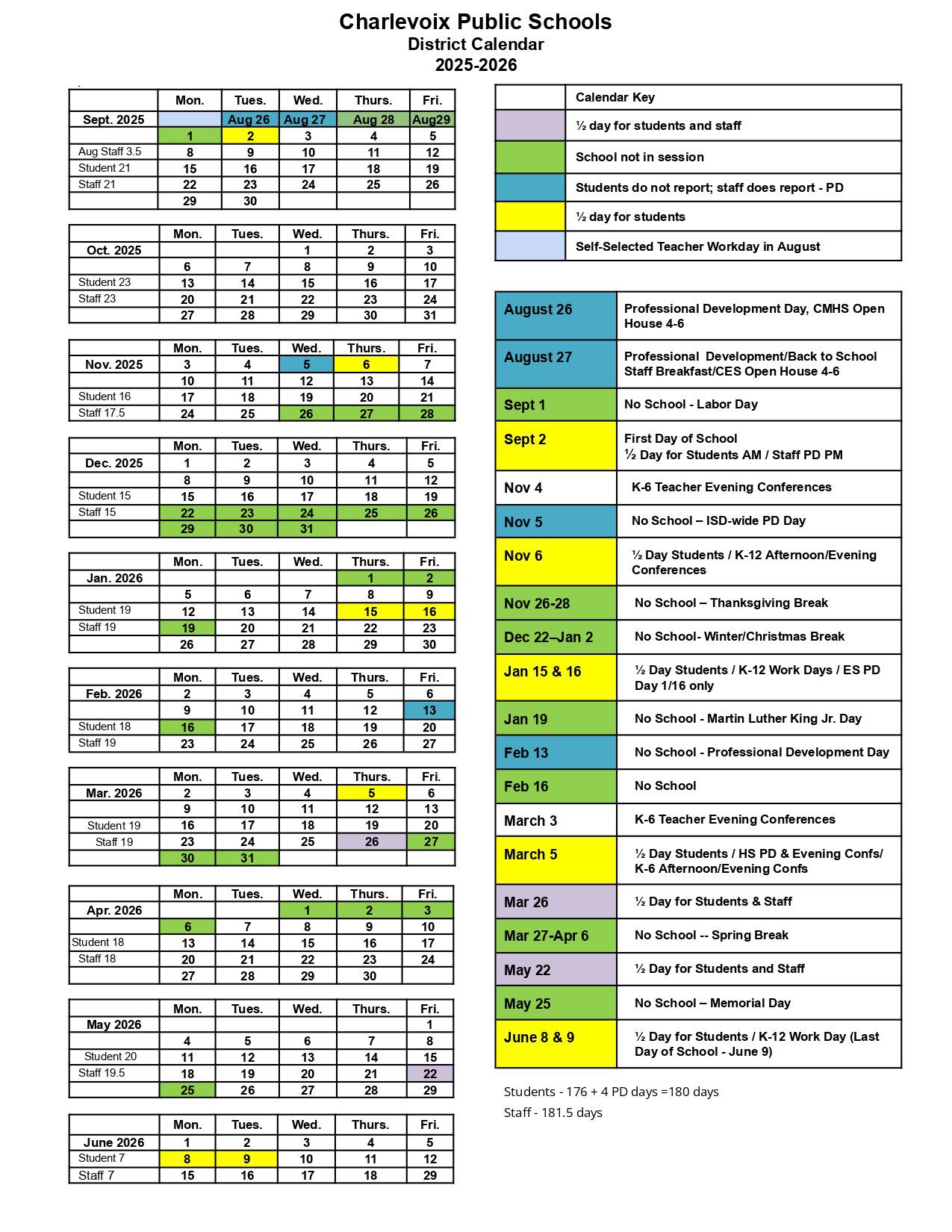 The school calendar provided on this page is taken from the official Charlevoix Public Schools MI School District website. Please note that all dates and events are subject to change at the discretion of the school district. For the most accurate and updated information, please refer to the official district website or contact the school helpline.