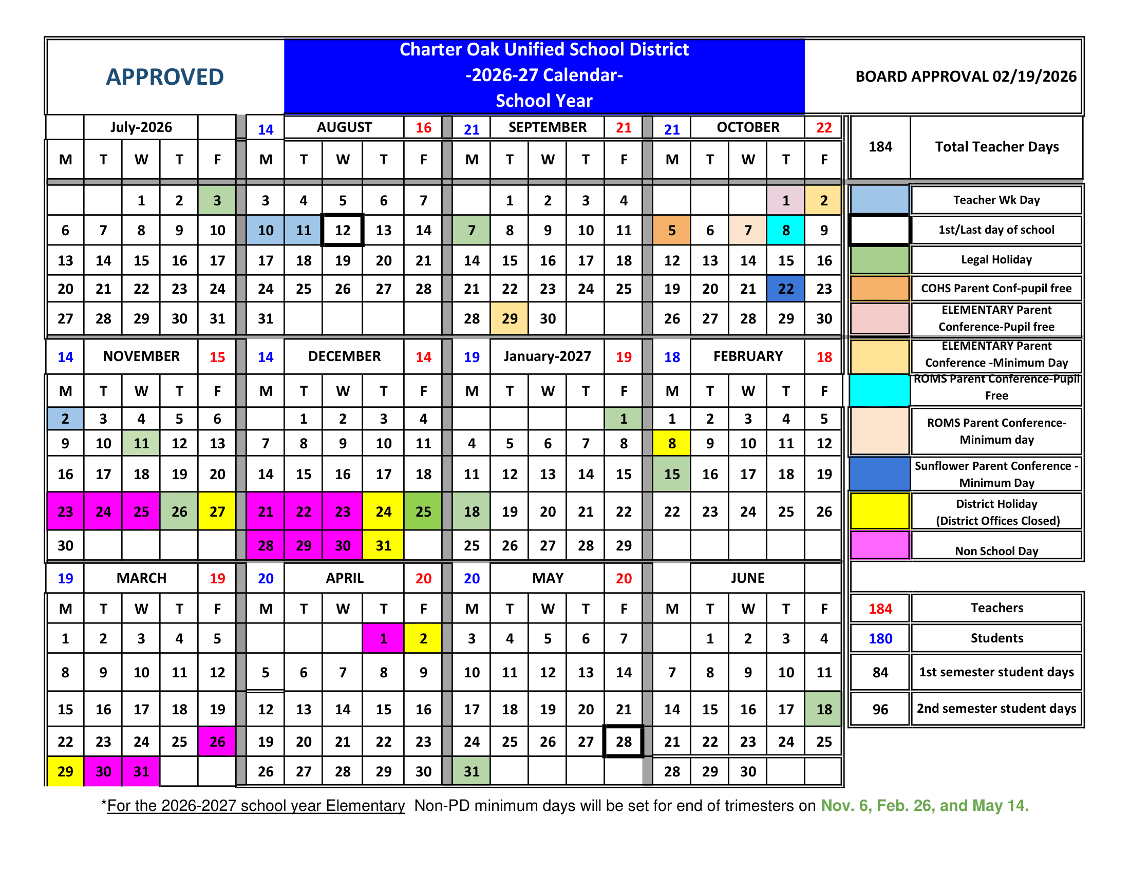 Dates are sourced from the official Charter Oak Unified School District Calendar 26-27 [PDF] website. Dates may change at the discretion of the district. Always verify with the official school website for the latest updates.