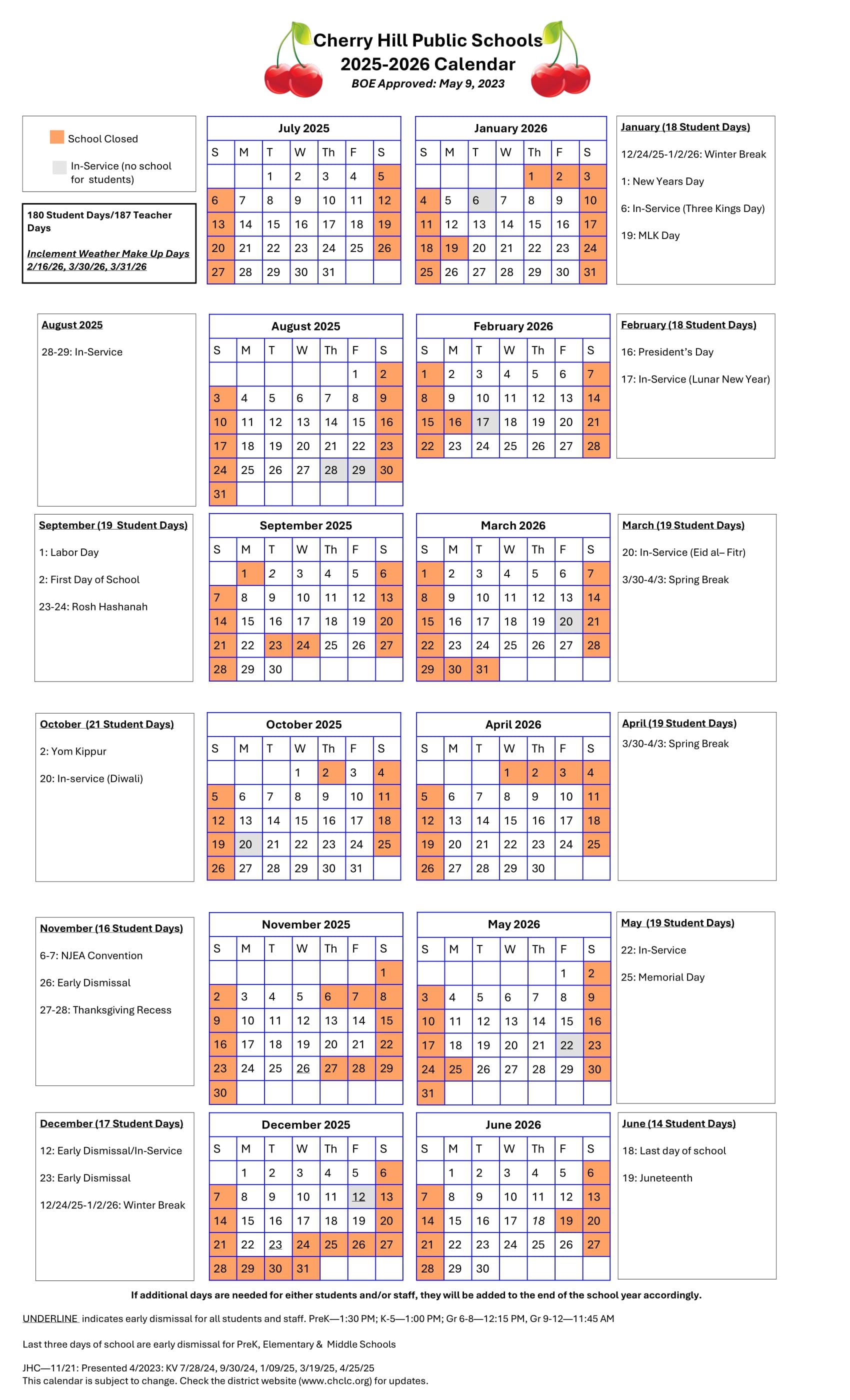 The printable school calendar provided on this page is taken from the official Cherry Hill Public Schools District calendar District website. Please note that all dates and events are subject to change at the discretion of the school district. For the most accurate and updated information, please refer to the official district website or contact the school helpline.