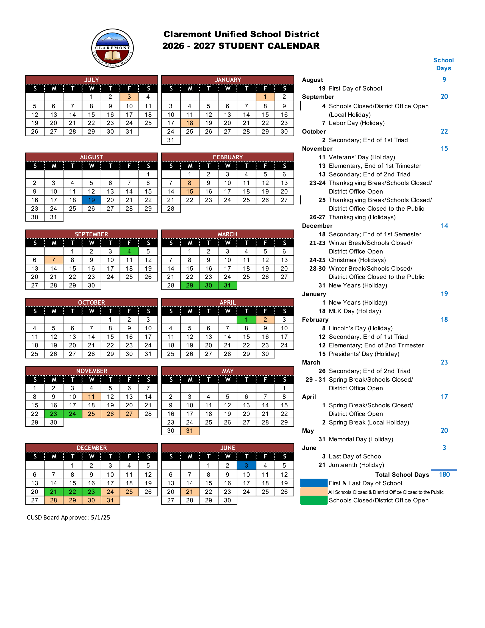 Dates are sourced from the official Claremont Unified School District Calendar 26-27 [PDF] website. Dates may change at the discretion of the district. Always verify with the official school website for the latest updates.