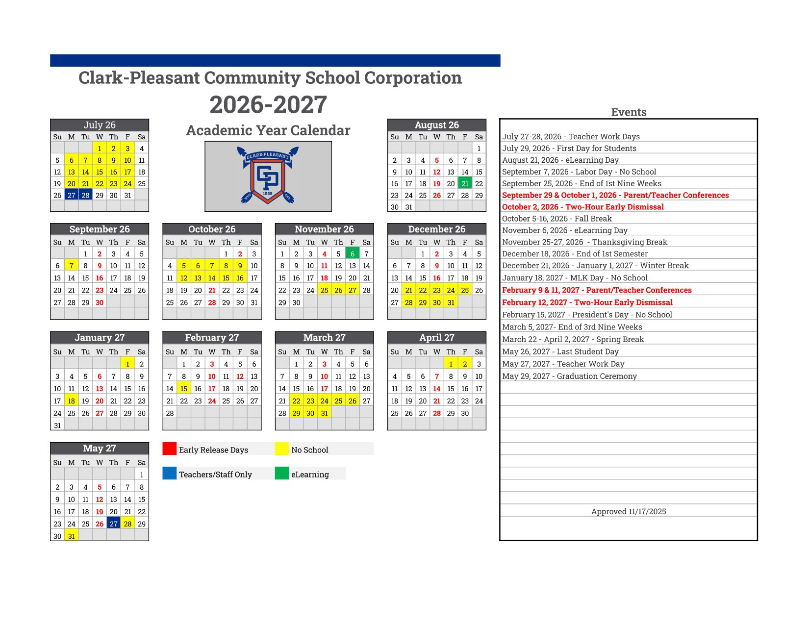 Dates are sourced from the official Clark-Pleasant Community School Calendar 26-27 [PDF] website. Dates may change at the discretion of the district. Always verify with the official school website for the latest updates.