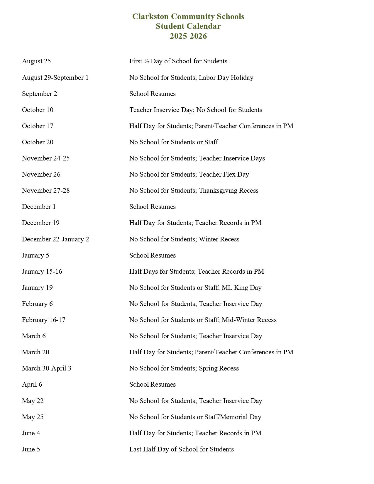 The school calendar provided on this page is taken from the official Clarkston Community Schools MI School Michigan School District website. Please note that all dates and events are subject to change at the discretion of the school district. For the most accurate and updated information, please refer to the official district website or contact the school helpline.