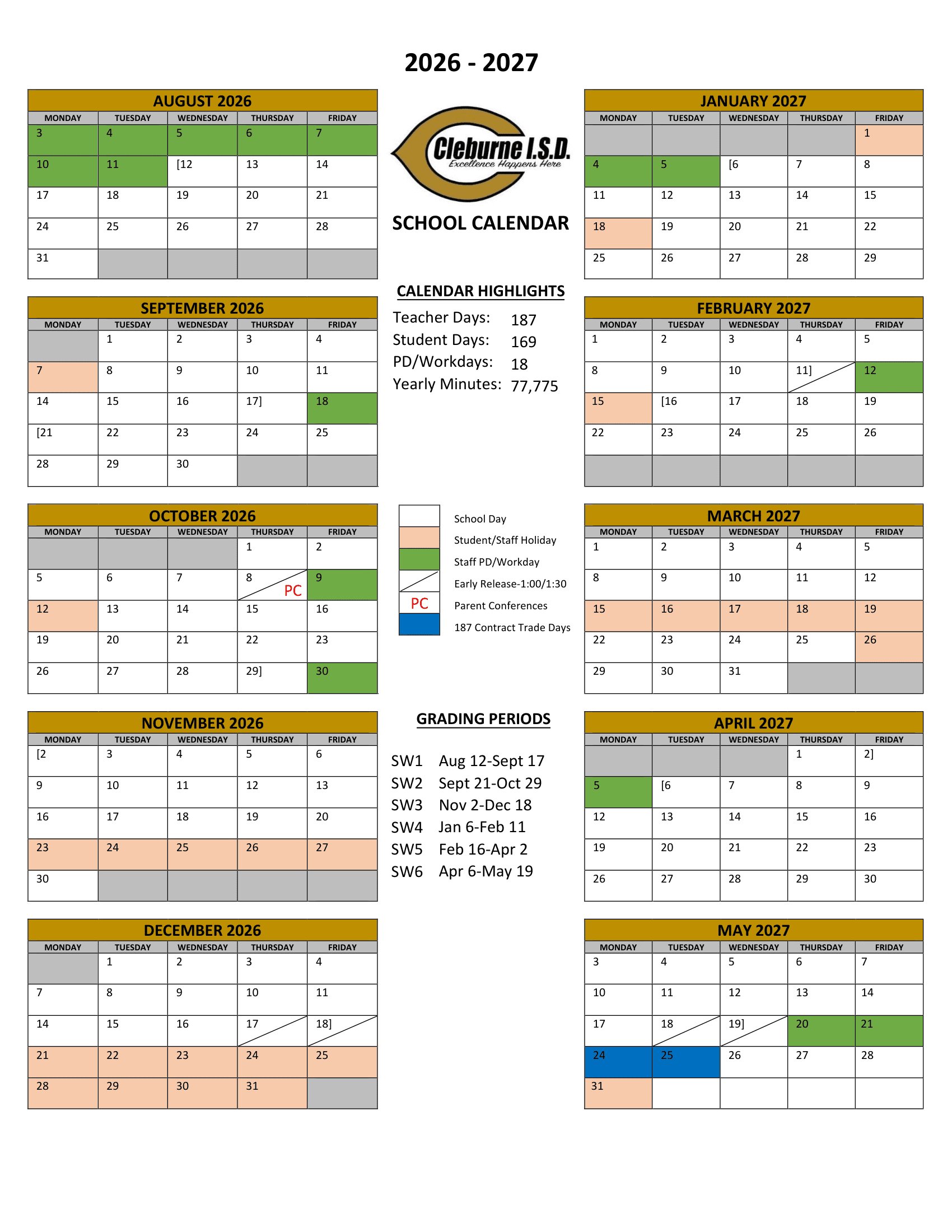 Dates are sourced from the official Cleburne ISD 26-27 Calendar [PDF] website. Dates may change at the discretion of the district. Always verify with the official school website for the latest updates.
