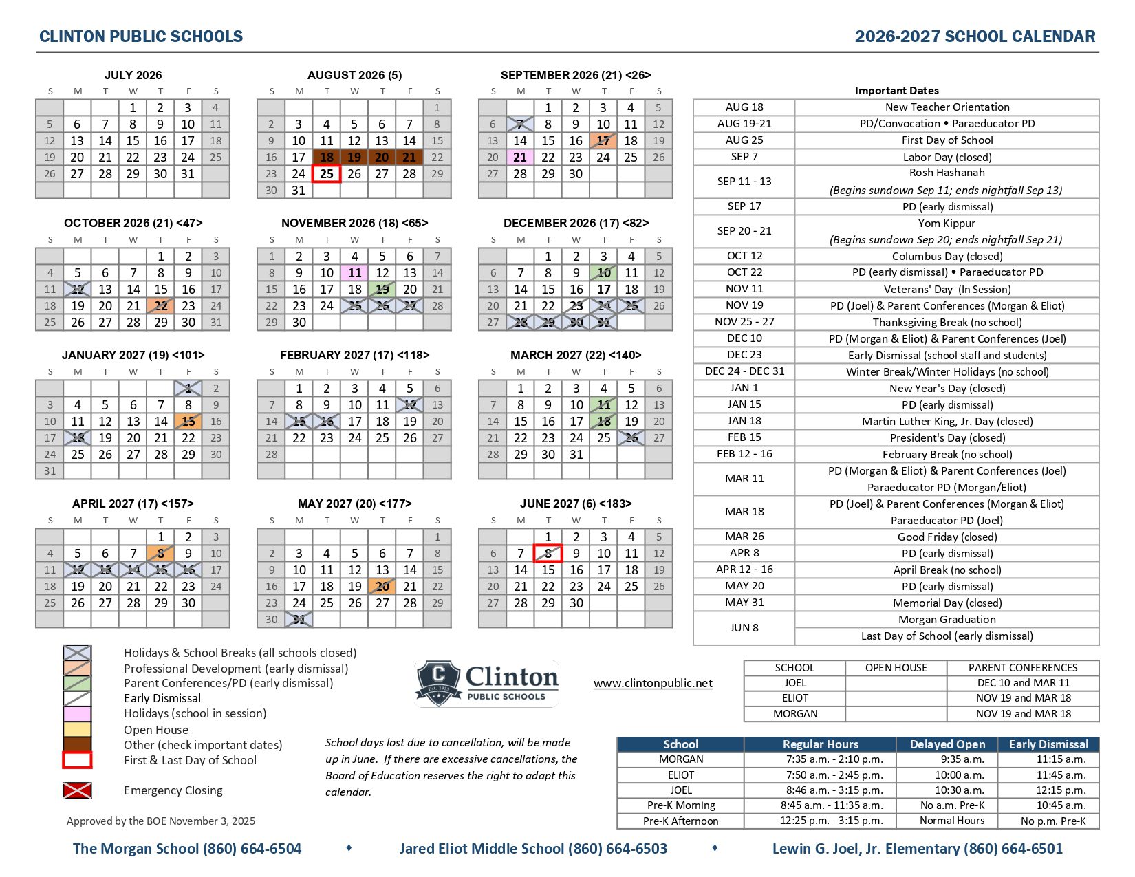 Dates are sourced from the official Clinton Public Schools ct Calendar 26-27 Revised PDF website. Dates may change at the discretion of the district. Always verify with the official school website for the latest updates.