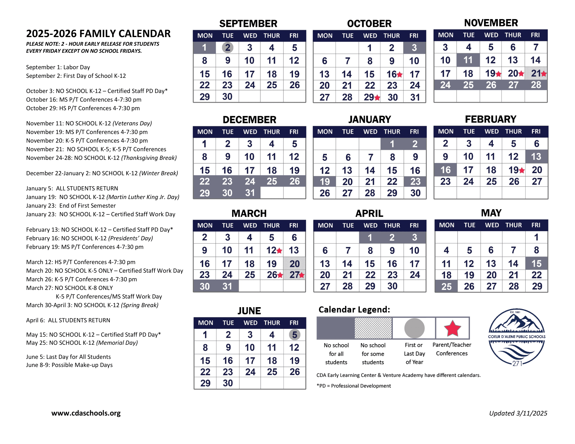 Dates are sourced from the official Coeur d'Alene Public Schools 271 26-27 Calendar [PDF] website. Dates may change at the discretion of the district. Always verify with the official school website for the latest updates.