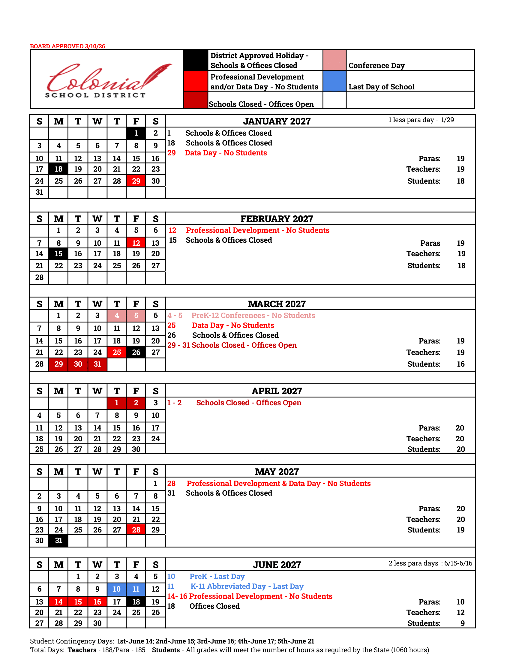 Colonial School District Calendar (2026-2027)