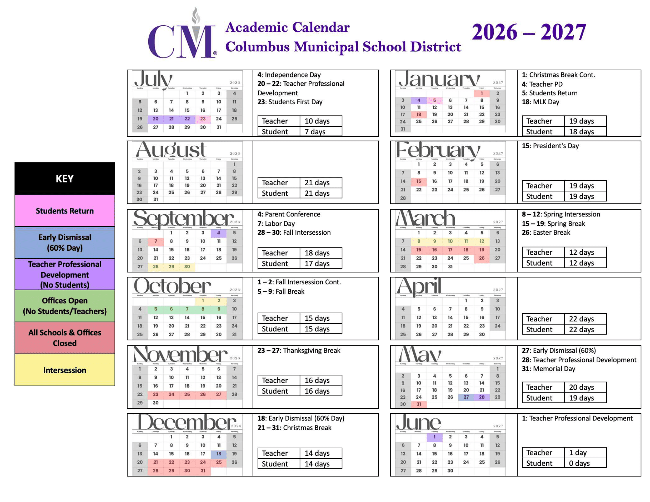 Dates are sourced from the official Columbus Municipal School District Calendar 26-27 UPDATED [PDF] website. Dates may change at the discretion of the district. Always verify with the official school website for the latest updates.