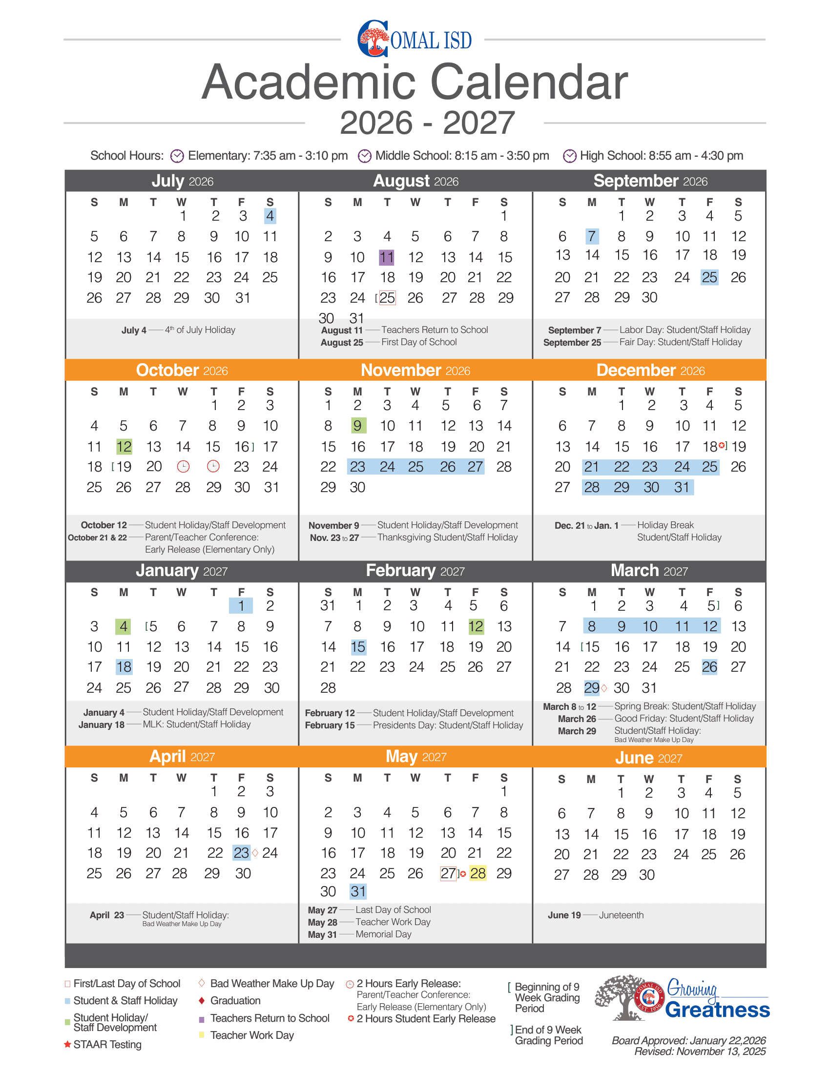 Dates are sourced from the official Comal ISD Calendar 26-27 Revised website. Dates may change at the discretion of the district. Always verify with the official school website for the latest updates.