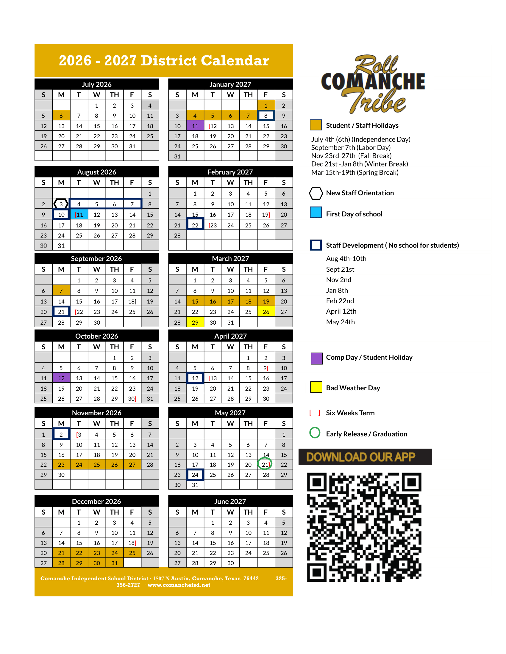 Dates are sourced from the official Comanche Independent School ISD Calendar 26-27 Revised [PDF] website. Dates may change at the discretion of the district. Always verify with the official school website for the latest updates.