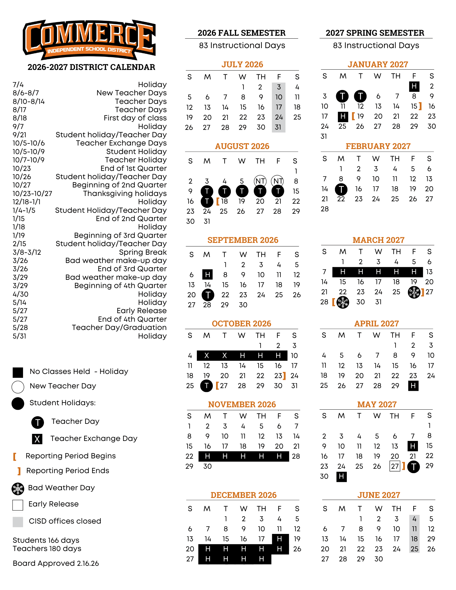 Dates are sourced from the official Commerce ISD Calendar 26-27 Revised [PDF] website. Dates may change at the discretion of the district. Always verify with the official school website for the latest updates.