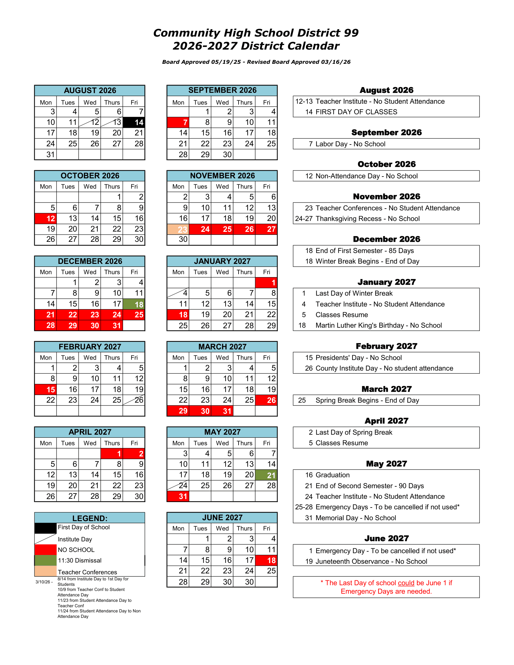 Dates are sourced from the official Community High School District 99 CSD99 26-27 Calendar [PDF] website. Dates may change at the discretion of the district. Always verify with the official school website for the latest updates.