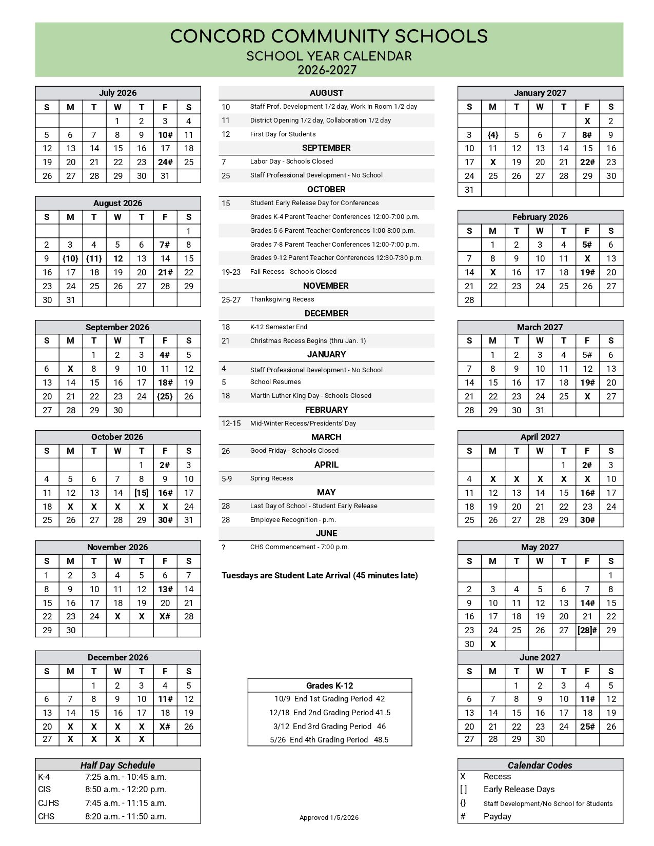 Dates are sourced from the official Concord Community Schools Calendar 26-27 [PDF] website. Dates may change at the discretion of the district. Always verify with the official school website for the latest updates.