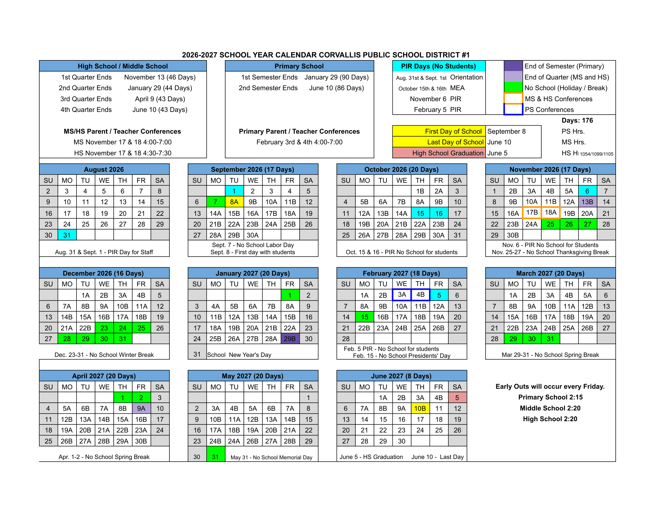 The last day of school for Corvallis Public School District #1 in the 2026-2027 school year is June 10, 2027.