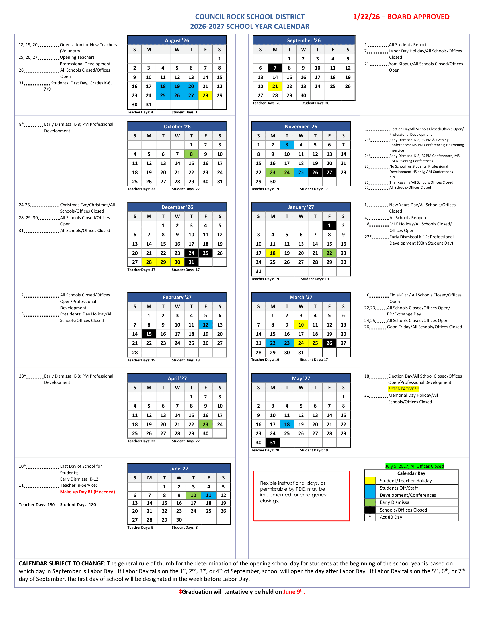 Dates are sourced from the official Council Rock School District Calendar 26-27 Calendar Updated [PDF] website. Dates may change at the discretion of the district. Always verify with the official school website for the latest updates.