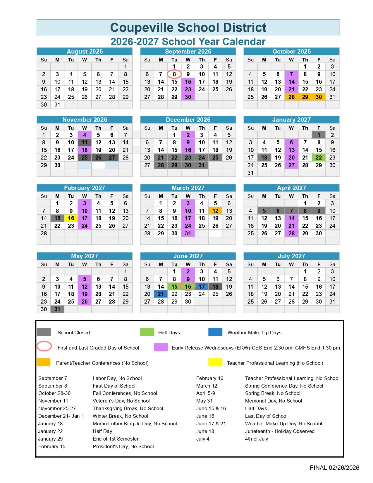 Coupeville School District  WA Calendar 26/27 Updates
