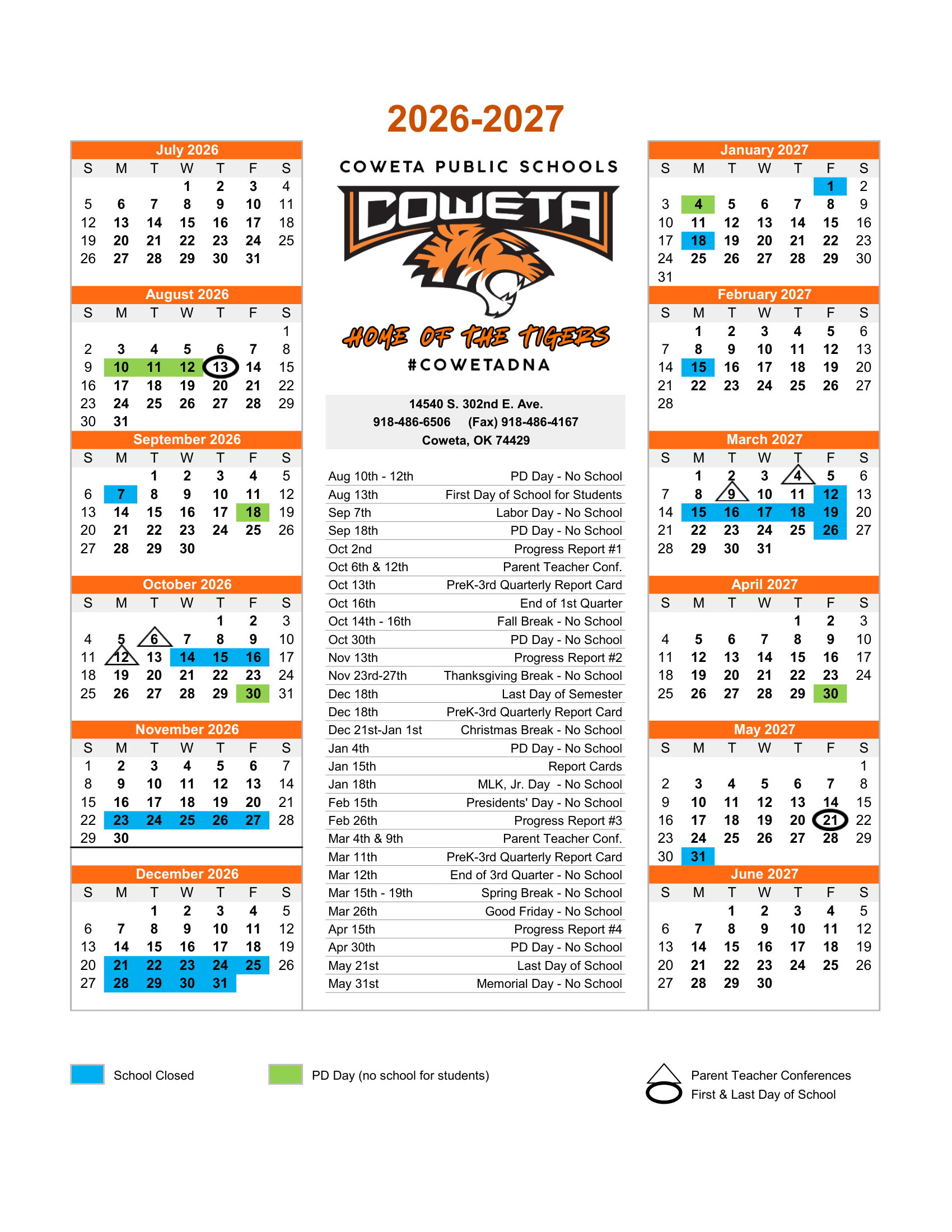 Dates are sourced from the official Coweta Public Schools Calendar 26-27 Updates website. Dates may change at the discretion of the district. Always verify with the official school website for the latest updates.