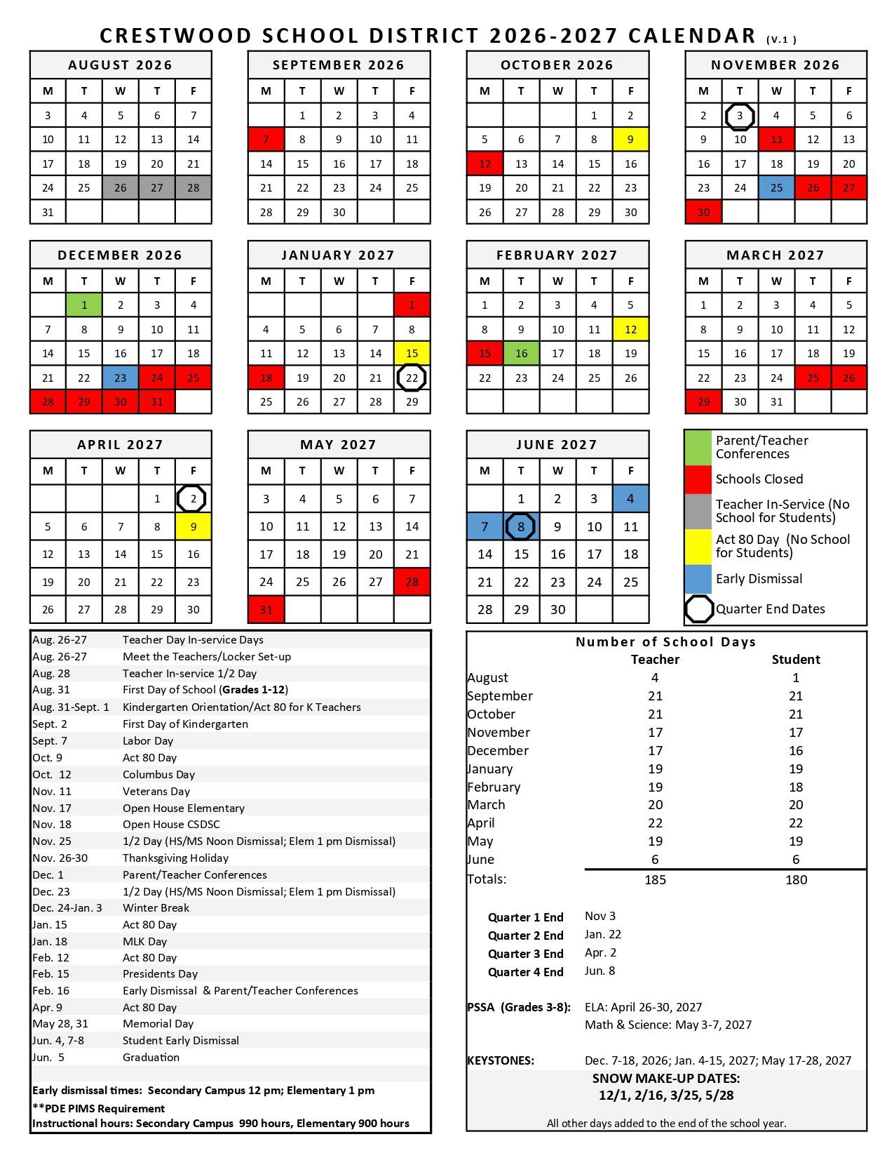 The Printable school calendar provided on this page is taken from the official Crestwood School District PA Calendar 26-27 Updates. Please note that all dates and events are subject to change at the discretion of the school district. For the most accurate and updated information, please refer to the official district website or contact the school helpline.