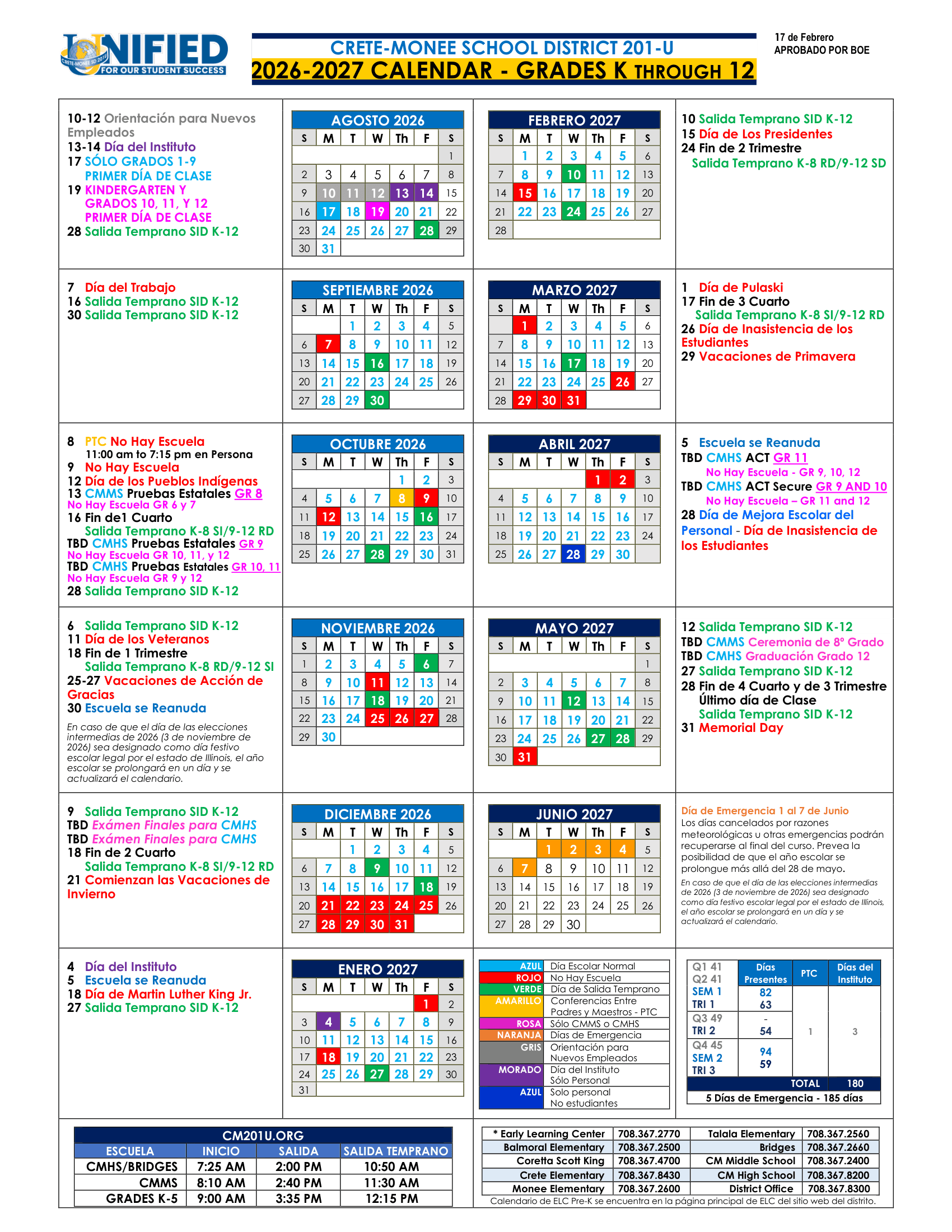 Dates are sourced from the official Crete-Monee School District CM201-U 26-27 Calendar [PDF] website. Dates may change at the discretion of the district. Always verify with the official school website for the latest updates.