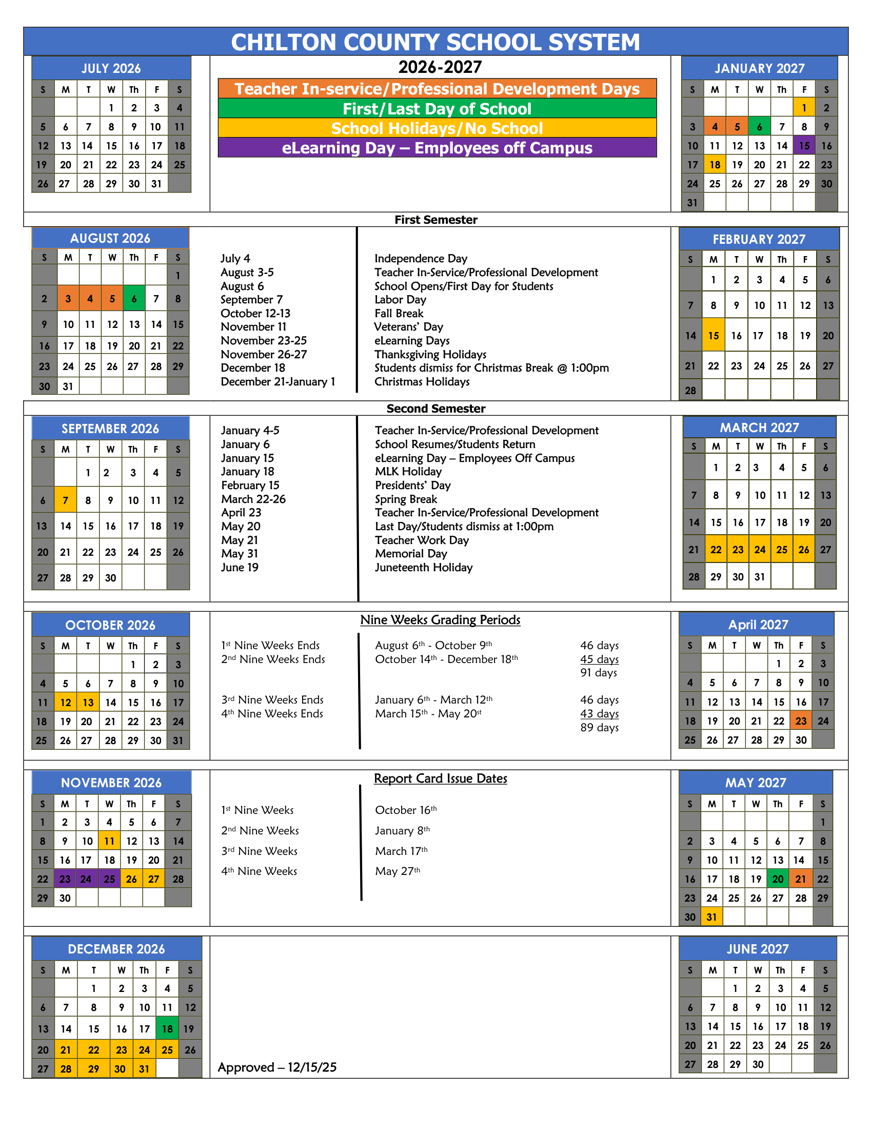Dates are sourced from the official Chilton County School System Calendar 26-27 Revised website. Dates may change at the discretion of the district. Always verify with the official school website for the latest updates.