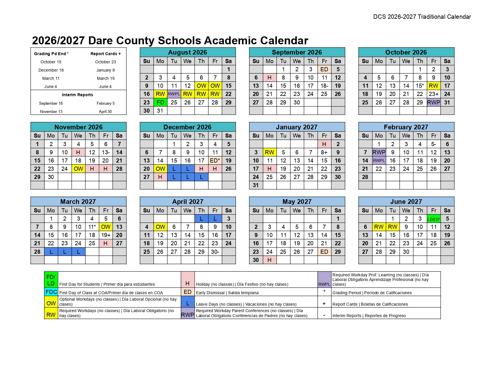 Dates are sourced from the official Dare County Schools Calendar 26-27 [PDF] website. Dates may change at the discretion of the district. Always verify with the official school website for the latest updates.