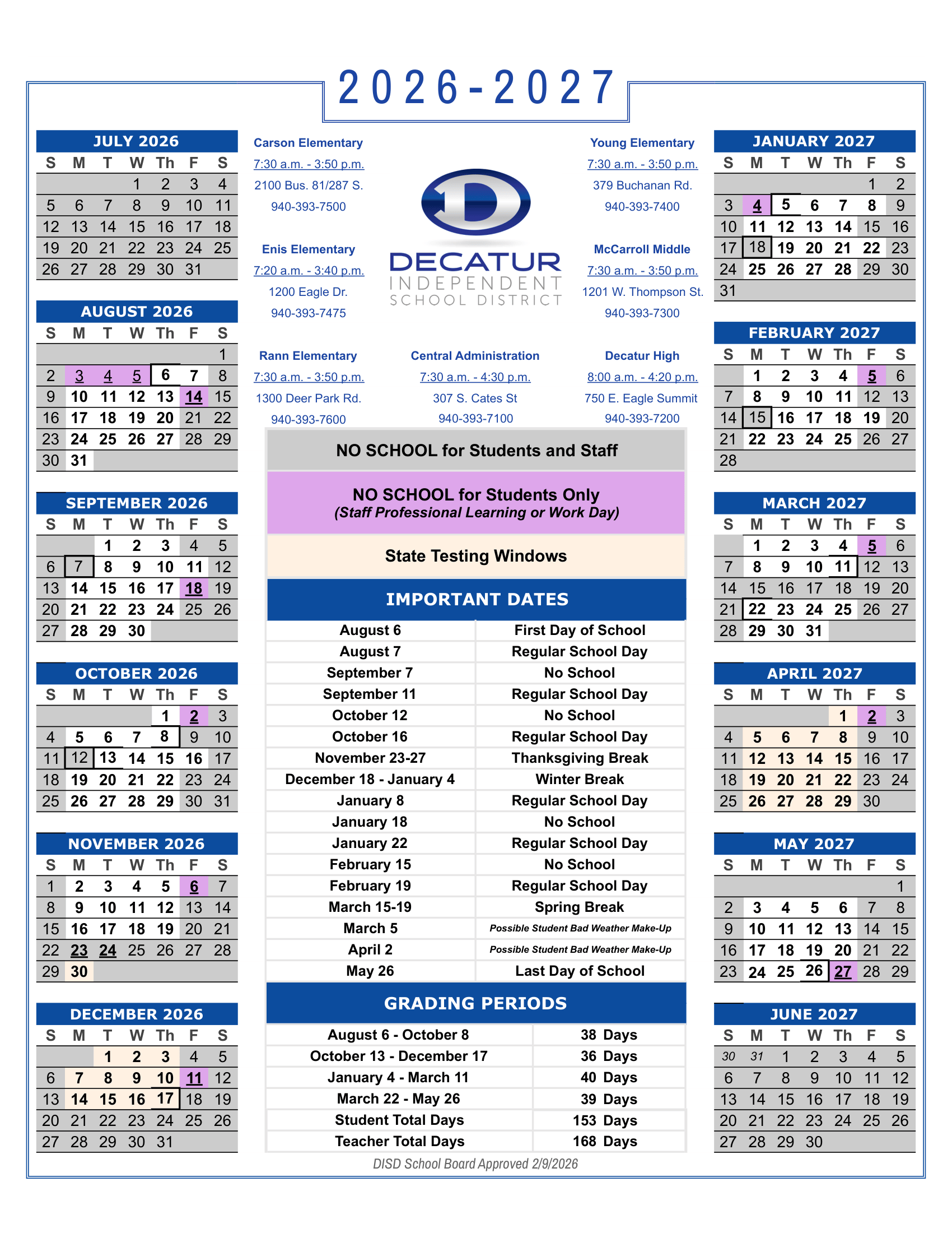 Dates are sourced from the official Decatur ISD Calendar 26-27 Revised [PDF] website. Dates may change at the discretion of the district. Always verify with the official school website for the latest updates.