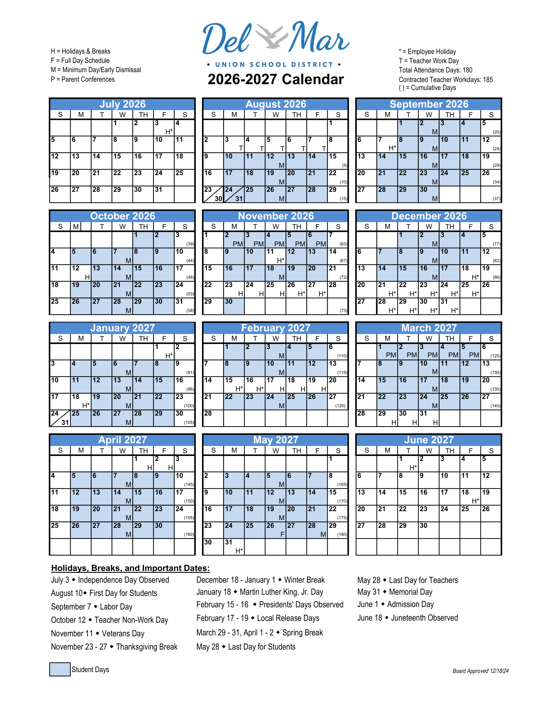 Dates are sourced from the official Del Mar DMUSD Union School District 26-27 Calendar [PDF] website. Dates may change at the discretion of the district. Always verify with the official school website for the latest updates.