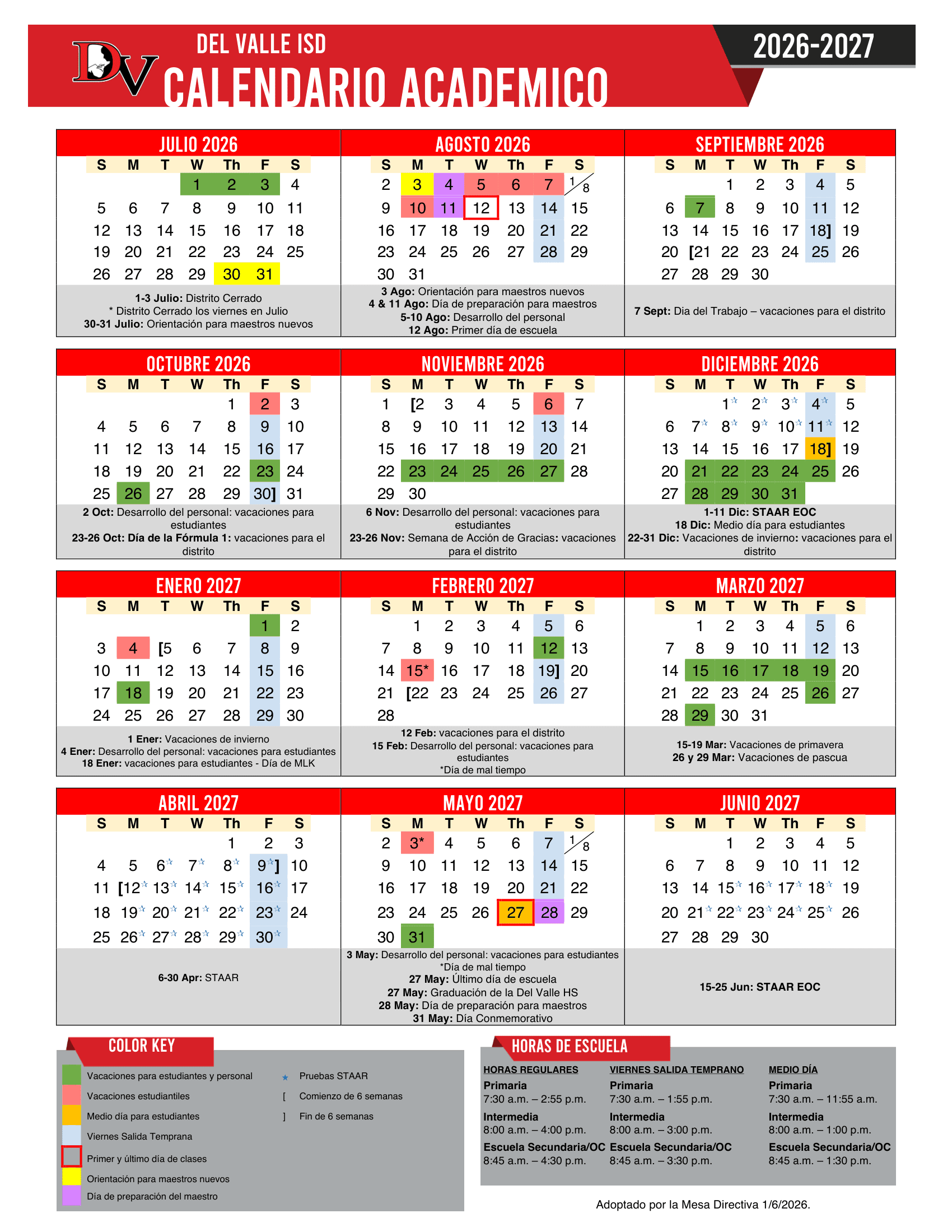 Dates are sourced from the official Del Valle ISD 26-27 Calendar [PDF] website. Dates may change at the discretion of the district. Always verify with the official school website for the latest updates.