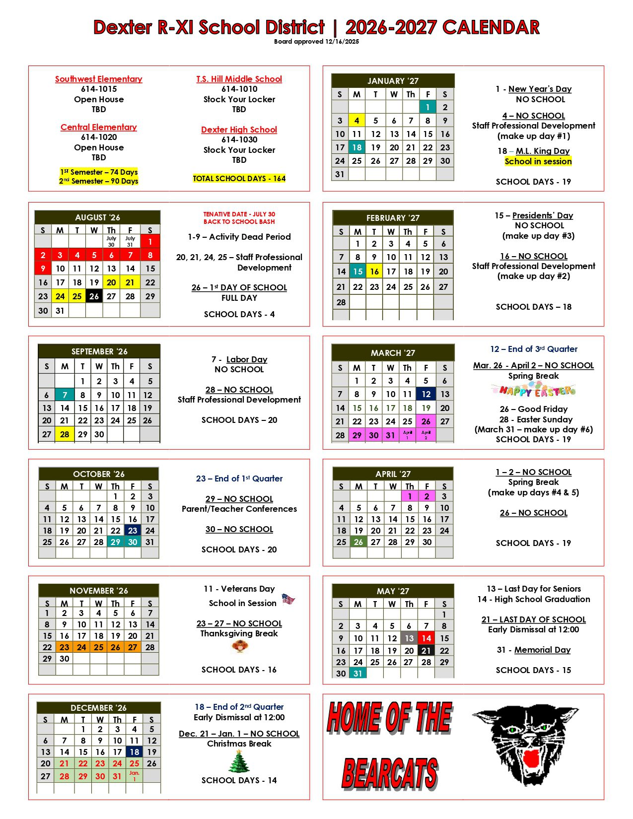 The Printable school calendar provided on this page is taken from the official Dexter R-XI Calendar 26-27 Updated. Please note that all dates and events are subject to change at the discretion of the school district. For the most accurate and updated information, please refer to the official district website or contact the school helpline.
