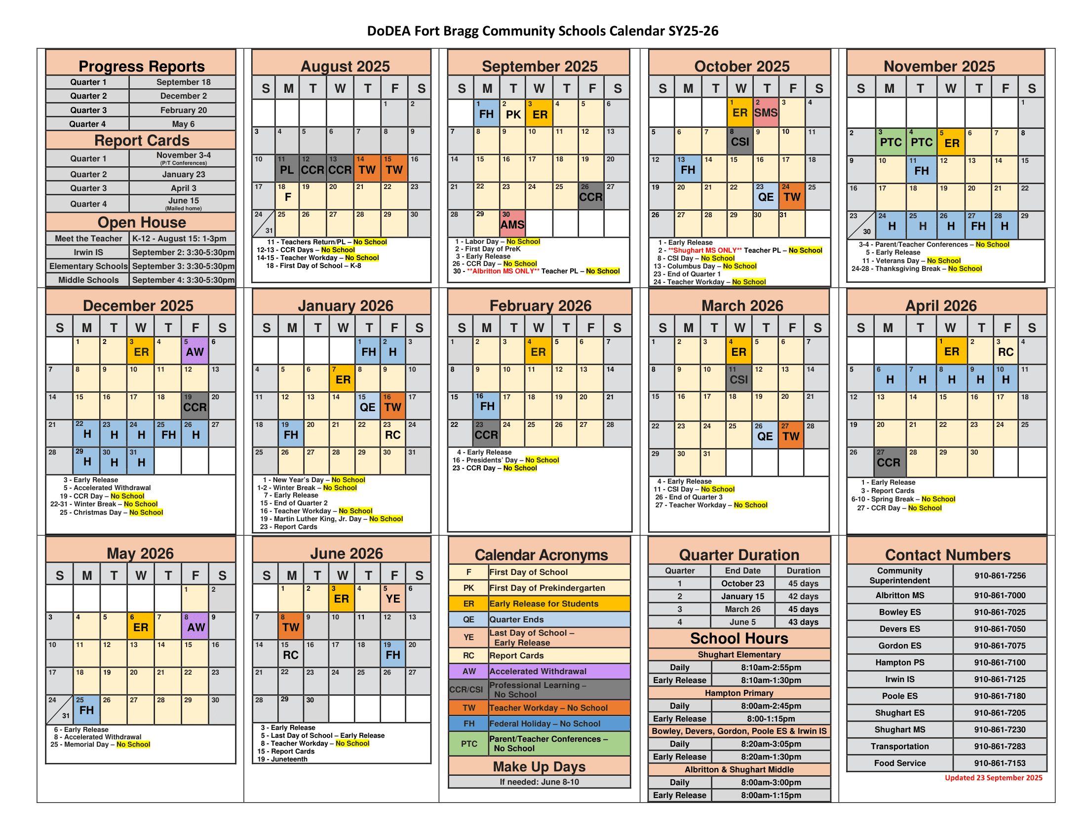 Dates are sourced from the official DoDEA Fort Bragg Community Schools Calendar 25-26 Revised [PDF] website. Dates may change at the discretion of the district. Always verify with the official school website for the latest updates.