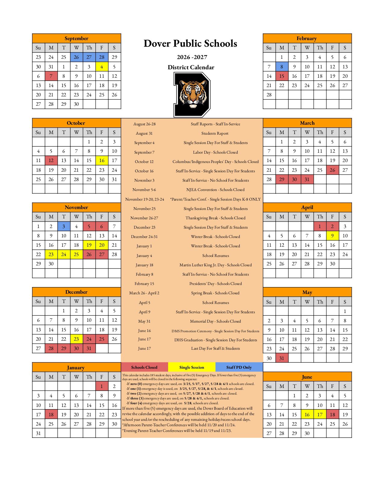 Dates are sourced from the official Dover Public Schools Calendar 26-27 Updates website. Dates may change at the discretion of the district. Always verify with the official school website for the latest updates.