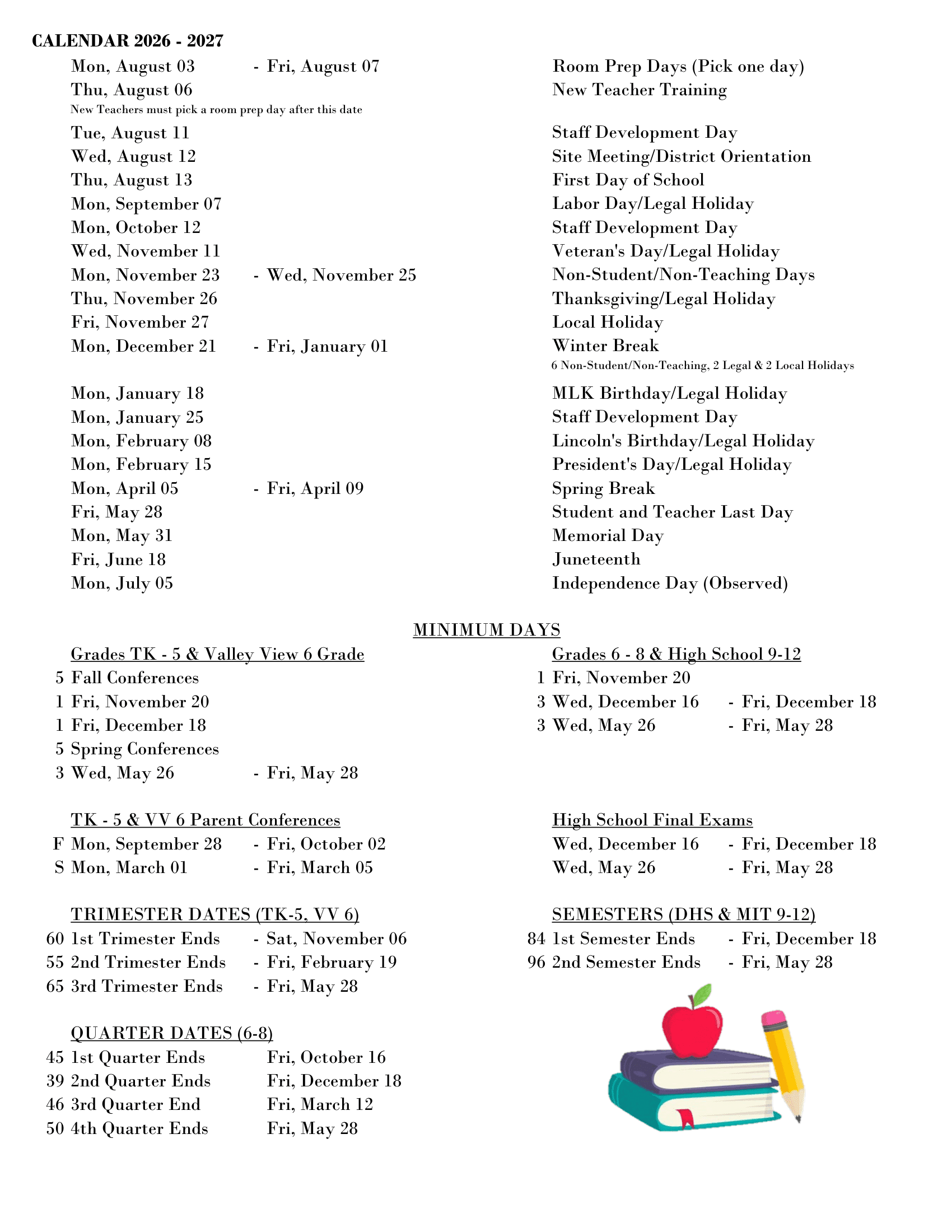 Official School Calendar for Academic Year 2026–2027