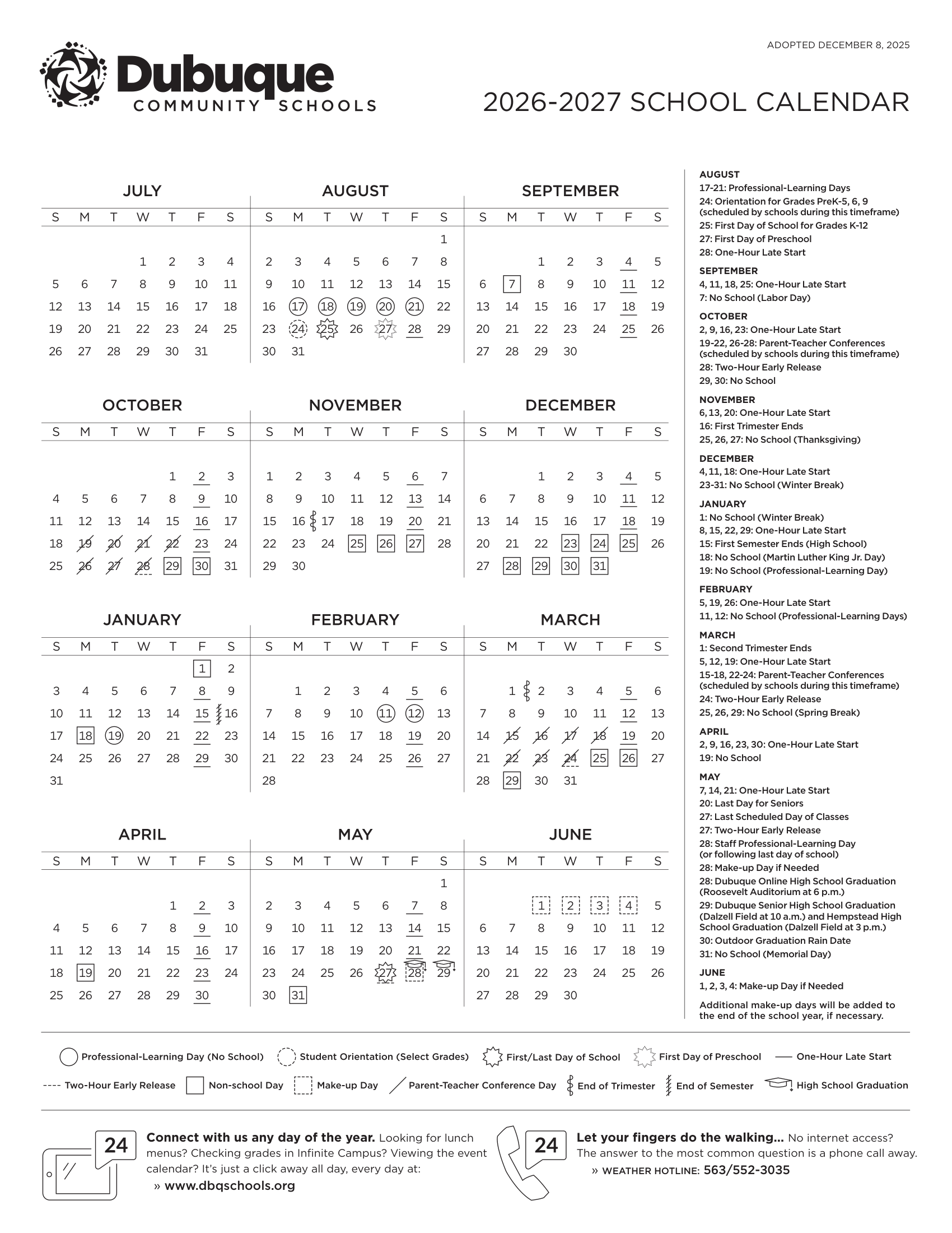 Dates are sourced from the official Dubuque Community Schools 26-27 Calendar Revised [PDF] website. Dates may change at the discretion of the district. Always verify with the official school website for the latest updates.