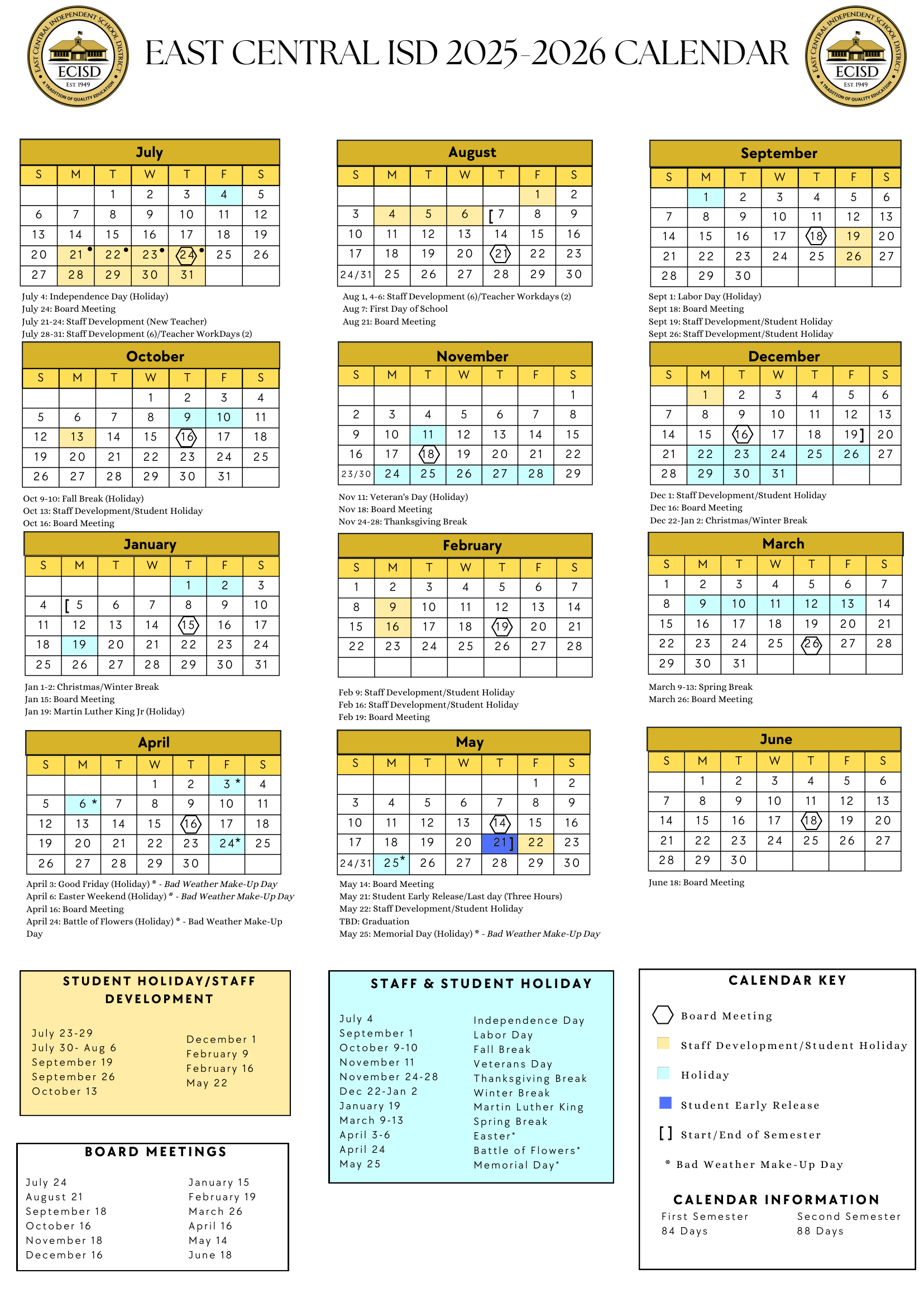 Dates are sourced from the official East Central ISD 26-27 Calendar [PDF] website. Dates may change at the discretion of the district. Always verify with the official school website for the latest updates.