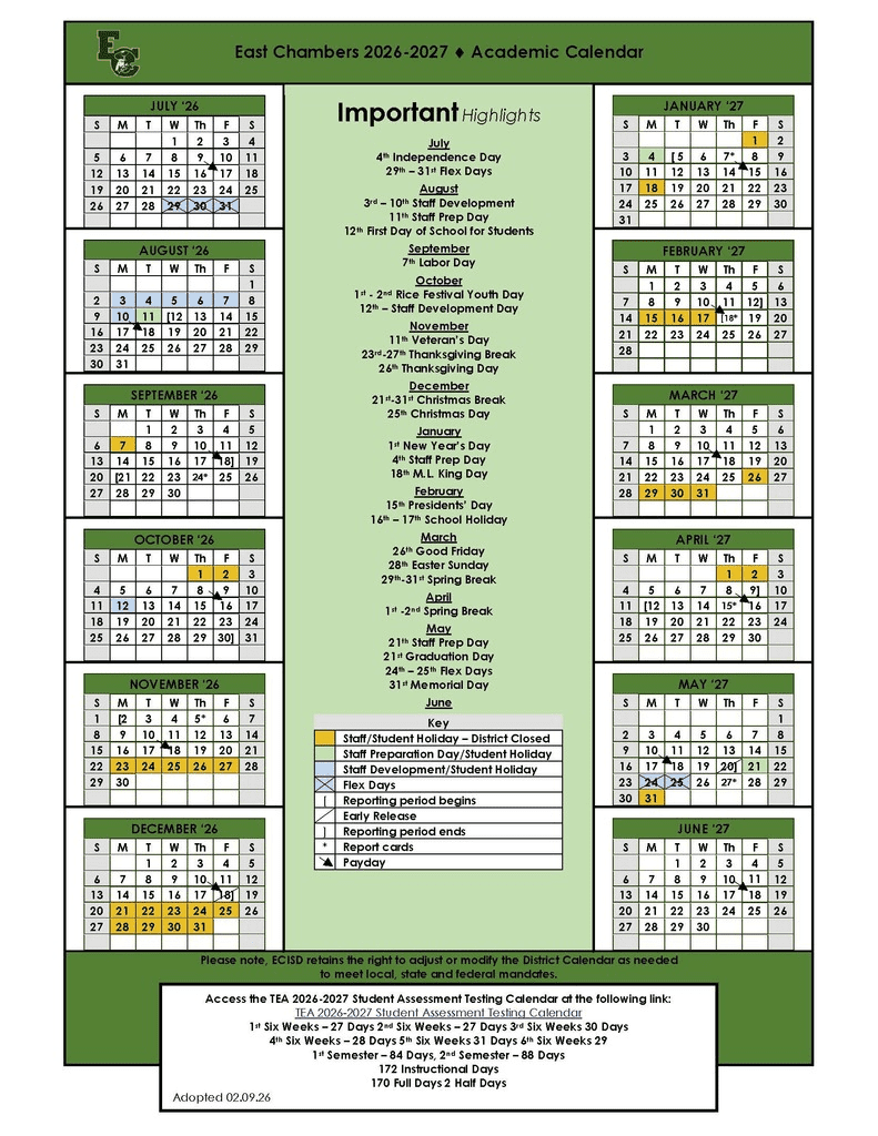 Dates are sourced from the official East Chambers ISD Calendar 26-27 Revised [PDF] website. Dates may change at the discretion of the district. Always verify with the official school website for the latest updates.