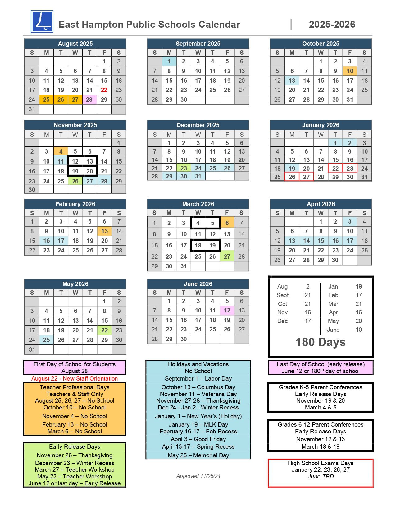 The printable school calendar provided on this page is taken from the official East Hampton Public Schools Calendar website. Please note that all dates and events are subject to change at the discretion of the school district. For the most accurate and updated information, please refer to the official district website or contact the school helpline.