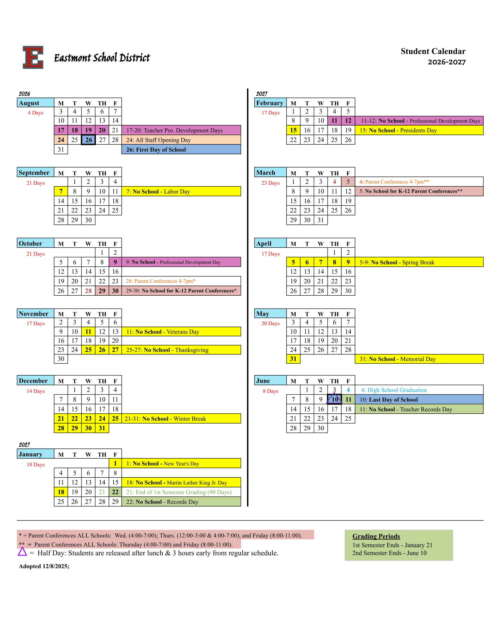 Dates are sourced from the official Eastmont School District 26-27 Calendar Revised [PDF] website. Dates may change at the discretion of the district. Always verify with the official school website for the latest updates.