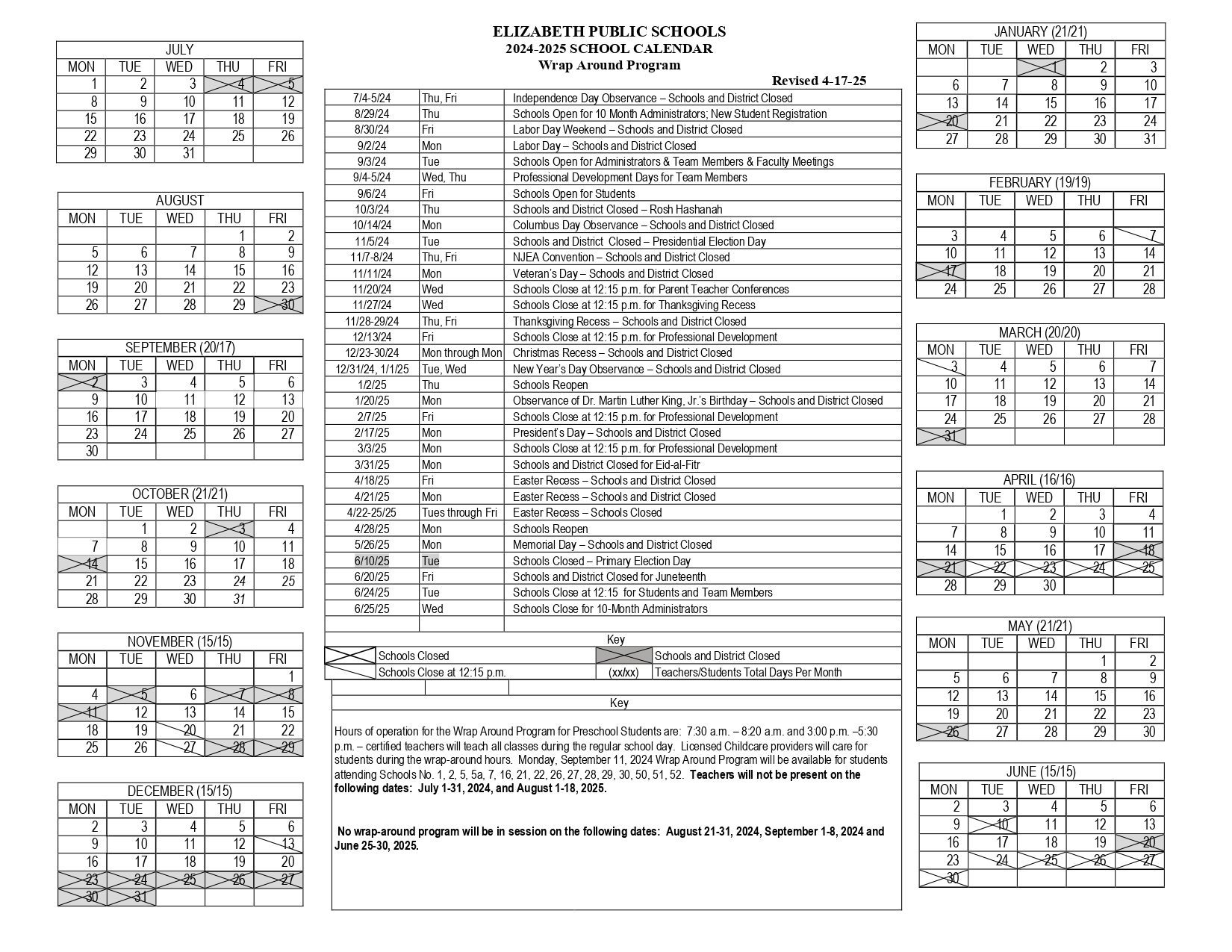 ELIZABETH PUBLIC SCHOOLS Calendar (2024-2025)