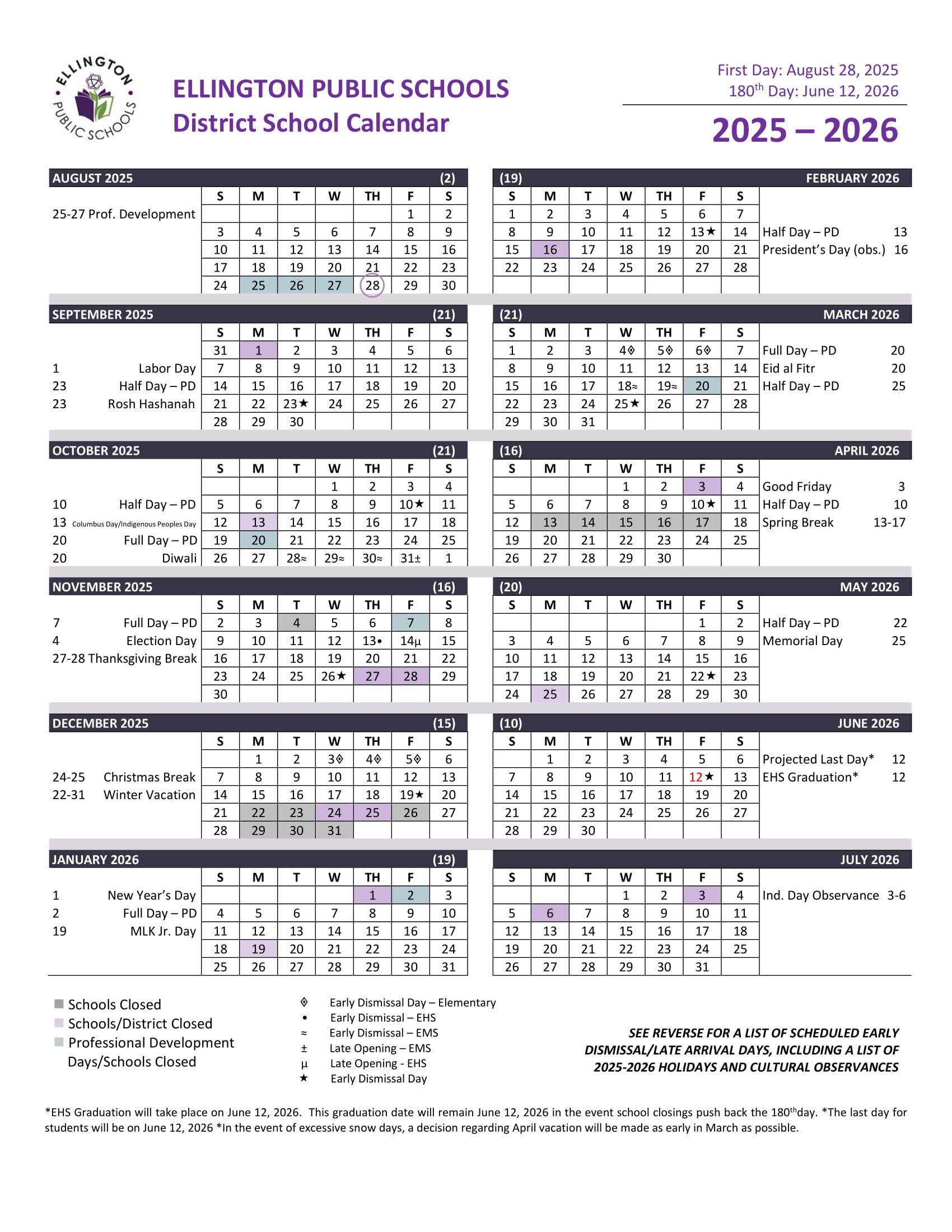 The printable school calendar provided on this page is taken from the official Ellington Public Schools Calendar website. Please note that all dates and events are subject to change at the discretion of the school district. For the most accurate and updated information, please refer to the official district website or contact the school helpline.